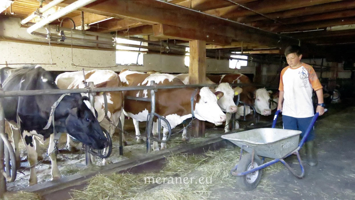 In einer großen Gaststube, die 25 Leuten Platz bietet, kann man die hofeigenen Köstlichkeiten verzehren: den Speck, der in einer Räucherkammer unter Zugabe von Kranewitt geselcht wird, die Eier von glücklichen Hennen, den Käse, die Schweinswurst, das eingelegte Sauerkraut. Dazu werden selbst gebackene Paarlen, Vollkornbrot, Schüttelbrot (gewürzt mit Brotklee!) und Weißbrot aus „Regio-Korn“ (Vinschger Korn) gereicht. Eine Spezialität ist der süße Zopf aus Weißbrot und Butter, der von der Hausherrin mit Liebe geflochten wird. Gebacken wird in zwei modernen Backöfen im großzügigen Arbeitsraum.