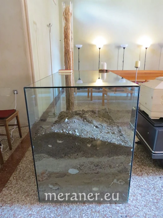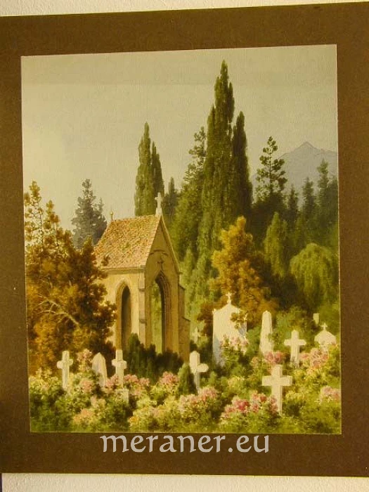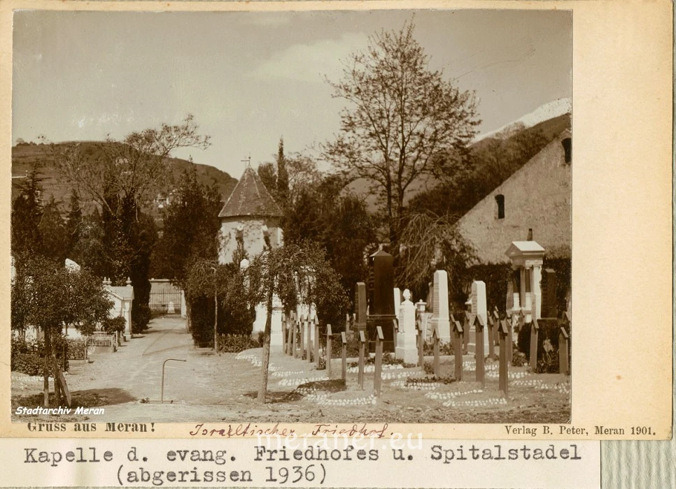 Aufgrund der ständig wachsenden Beisetzungen (allein 1895 waren es deren 31) machte sich die Evangelische Gemeinde im Jahre 1896 auf die Suche nach einem geeigneten Gelände für einen neuen, geräumigeren Friedhof. Schließlich wurden zu diesem Zweck 3000 Klafter Wiesengrund am unteren Greutendamm ( = das linke Passerufer; die dahinter liegende Obstwiesen sind die Greitenlegen) erworben, die Anlage durchgeführt, eine Friedhofskapelle mit Leichenhalle und anschließender Wärterwohnung erbaut und am 10. Dezember 1897 seiner Bestimmung übergeben, so G. Kropp in: Kurzer Abriss der Geschichte der Evangelischen Kirchengemeinde zu Meran, ein Gedenkblatt zu ihrem 50jährigen Jubiläum, 1926, S. 10. (Abb. 3)