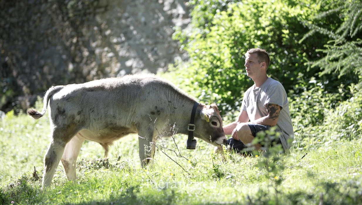 Neben dem Tiroler Grauvieh mit Hörnern gibt es weitere alte authentische Tierrassen wie das Schwäbisch-Hällische Landschwein, das Vorwerk- oder das deutschen Sperber Huhn – alte Hühnerrassen, die noch wüssten, so Petra schmunzelnd, wie das Brüten im Freien geht. Auch die muttergebundene Aufzucht der Kälber ist zu einem wichtigen Bestandteil der Philosophie des Hofes geworden. Sie bietet die Möglichkeit, die Kälber länger bei ihren Müttern zu lassen und die Kühe trotzdem zu melken. Diese Haltungsform wirkt sich sehr positiv auf die Gesundheit der Kälber und auch der Milchkühe aus. Um mit dieser Aufzuchtform erfolgreich zu sein, braucht es gute Kenntnisse des natürlichen Verhaltens der Kühe und der Kälber und eine intensive Mensch-Tier-Beziehung. „Wir haben eine Verantwortung und müssen auf die Tiere schauen“, betont Johnny. Deswegen werden auch Kälbertransporte vermieden. „Nur wenn die Tiere glücklich leben, wird ihr Fleisch und ihre Milch höchsten Qualitätsansprüchen gerecht“, unterstreicht er. Und dies ist der Anspruch der Tappeiners: höchste Qualität dank artgerechter Haltung. Fleisch- und Milchprodukte werden im eigenen Hofladen verkauft und die nähere Umgebung wird auch persönlich von Johnny beliefert. Wenn man sich die Zeit nimmt, erhält man von Johnny interessante Informationen und Auskünfte zur Biolandwirtschaft.