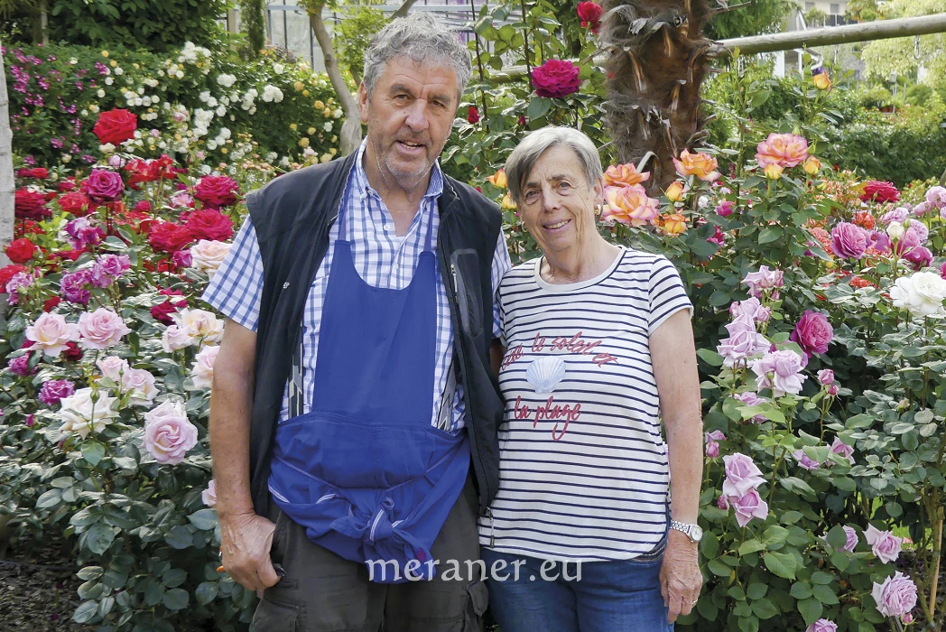 Die meisten Rentner verkleinern im letzten Lebensdrittel ihren Garten. Luis Egger aus Schenna tat das Gegenteil. In einem wunderschönen Rosengarten verwirklichte der ehemalige Installateur für Heizung und sanitäre Anlagen seinen Lebenstraum. 2012 übergab er seinem Sohn das erfolgreiche Familienunternehmen und seither widmet er sich mit Leidenschaft und Inbrunst seinem Rosengarten: einer blühenden, duftenden Oase inmitten von Schenna. Mittlerweile hat er 1.400 Rosenstöcke gepflanzt und ca. 700 verschiedene Rosensorten entfachen ein Feuerwerk an Farben, Düften und Formen. Alle Sorten sind bei ihm im Garten vertreten: Edelrosen, Beetrosen, Zwerg-, Strauch- und Kletterrosen. Die Rose ist kapriziös und die richtige Pflege höchst komplex. Von morgens bis abends steht er im Garten, denn es gibt immer etwas zu tun. „Rosen sind Primadonnen, empfindliche Prinzessinnen, die gehegt, gepflegt und gehätschelt werden wollen; nach einem Gewitter muss man sie aufrichten, sie wollen gedüngt werden, müssen richtig geschnitten und gegen Schädlinge und Parasiten geschützt werden“, erzählt uns der „Rosenkönig“, wie er mittlerweile von den Schennern liebevoll genannt wird.