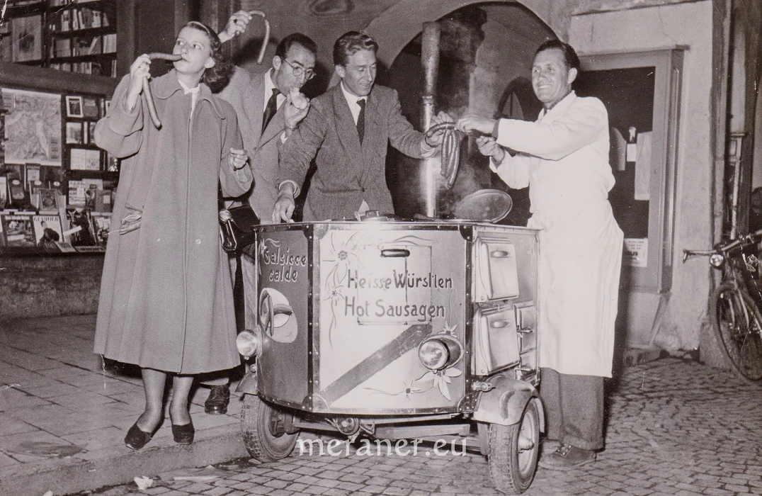 Das war nicht immer so. In den Nachkriegsjahren pulsierte das Nachtleben in Meran, es gab etliche Kinos, zahlreiche Nachtclubs und Gasthäuser, in denen bis in die frühen Morgenstunden das Leben tobte. Dies wissend, ist es nicht verwunderlich, dass das Würstlstandl am Pfarrplatz von Johann vulgo Hans Hofer von 6 Uhr abends bis 4 Uhr früh geöffnet hatte. Durch das Passeirertor, die Hallergasse und die Lauben schlängelte sich die Verkehrsader aus dem Passeiertal, selbstverständlich war das Verkehrsaufkommen noch bescheiden und störte die Würstelverzehrer wohl kaum.