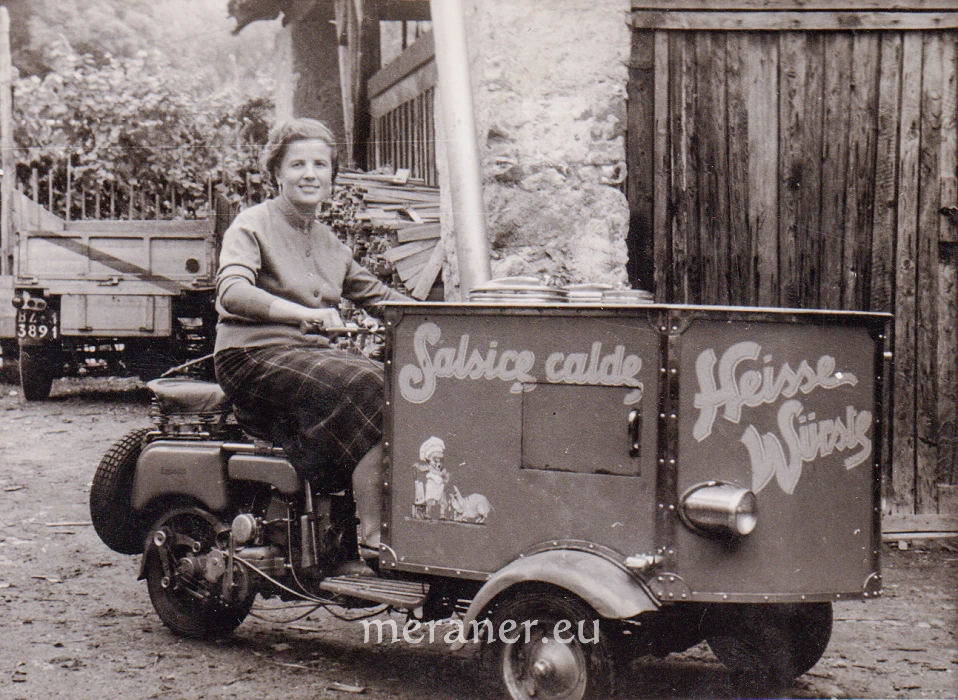 Gemeinsam mit seinem Bruder Sepp begann er das Würstlstandl-Geschäft. Anfänglich tingelten die beiden von Viehmarkt zu Viehmarkt, derer es viele gab und von denen der Stegener Markt und der Sealamorkt zu Allerseelen in Glurns auch heute noch bekannt sind. Ihren ersten Standplatz in Meran hatten sie vor dem Bozner Tor nahe dem Restaurant Sigmund und ihr Gefährt war ein modifiziertes Fahrrad, dem bald schon ein Verkaufs- und Zubereitungswagen folgte, der mit einem Motorrad fortbewegt werden konnte. „Gemeinsam mit einem Untermaiser Spengler tüftelte er ständig an neuen, besser ausgeklügelten Würstl-Fahrzeugen“, erzählt Edith. Naturgemäß verfügten die selbst gebauten Gefährte über einen Kessel für das Warmwasser und Stauraum zur Unterbringung der Gasflasche, eine Lade für das Brot, Schubladen für das Butterpapier, auf welchem die Wurst serviert wurde, Servietten und Senf.