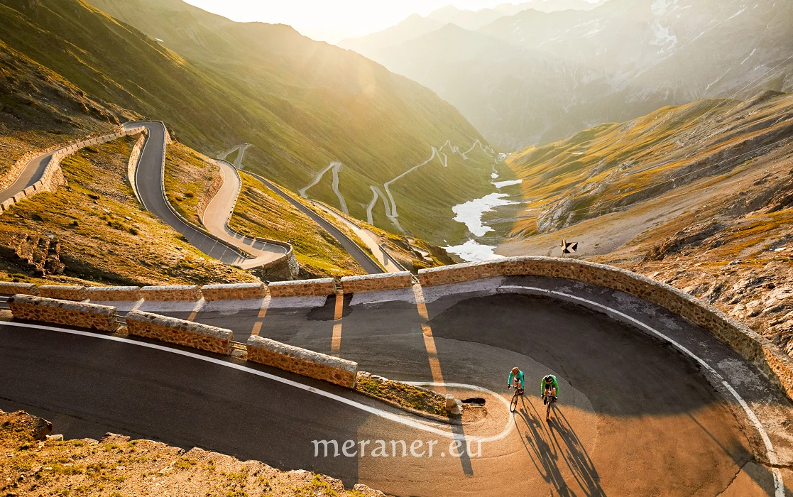 Die Luft zum Atmen wird merklich dünner. Für den sportlichen Radler sind fast 50 Kehren auf der beliebten Stilfser-Joch-Hochalpenstraße von Spondinig-Prad im Südtiroler Vinschgau bis nach Bormio im Veltlin geschafft, der beträchtliche Anstieg beträgt genau 1.842 Höhenmeter. Jetzt folgen noch weitere 34 Kehren, die Strecke geht dann nur noch abwärts bis nach Bormio. Erstmal muss er aber verschnaufen, denn immerhin ist er jetzt auf einer Höhe von 2.757 Metern, dem Stilfser Joch; auf der Passhöhe gibt es endlich Zeit, die gewaltige Bergkulisse von fast 4.000 m hohen Berggipfeln zu betrachten. Über das Joch führt die höchste, 49 km lange Passstraße Italiens; bis vor wenigen Jahren war die Staatsstraße SS 38 auch die höchstgelegene Passüberquerung Europas. Es sind an schönen Sommertagen hunderte gleichgesinnte sportliche Radfahrer auf dieser Quälstrecke unterwegs.