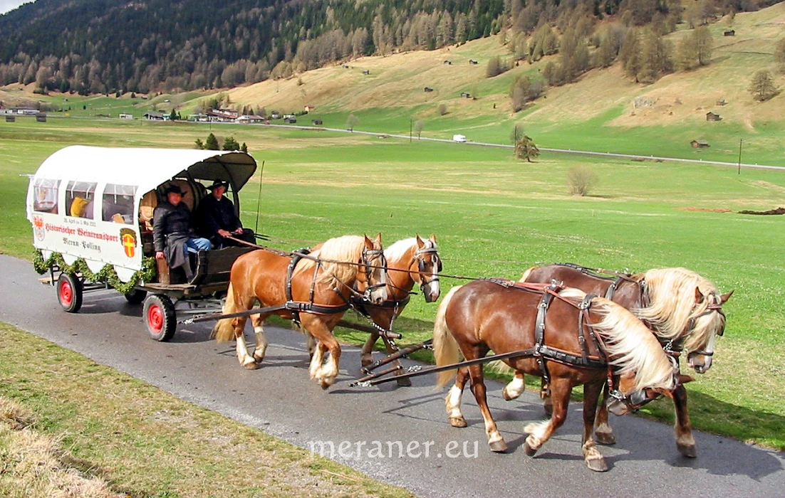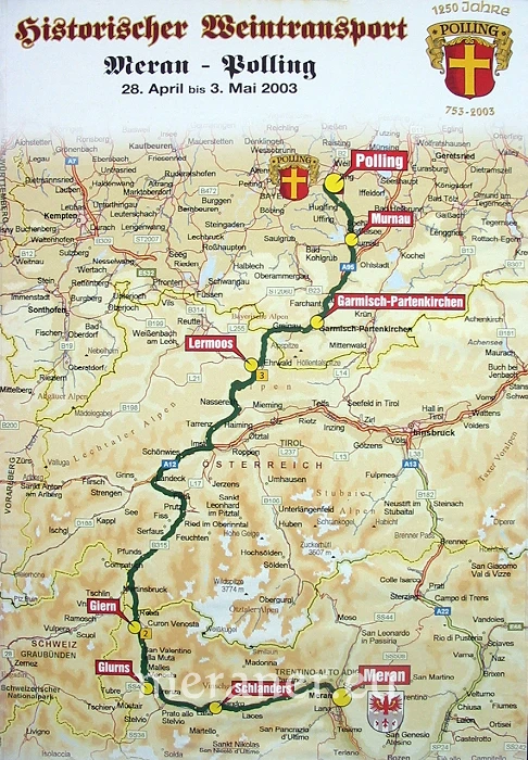 Als 2003 die 1.250-Jahresfeier der Gründung Pollings anstand, wurde ein legendärer Weintransport von Meran nach Polling organisiert. Mit einem Pferdegespann wurde ein Fass mit Meraner Wein, begleitet von einer Kutsche mit „Honoratioren“ in historischer Kleidung, über die Stationen Schlanders, Glurns, Giern (am Reschensee), Lermoos, Huglfing nach Polling transportiert. Damit wollten die Veranstalter in das Gedächtnis zurückgerufen, was Jahrhunderte lang gängige Praxis war.