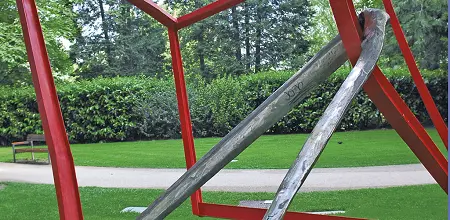 Seit einigen Wochen steht die Skulptur Über-raschung des Meraner Künstlers Eduard Habicher im südlichen Teil des Thermenparkes. Die Skulptur ist dank einer Initiative von Kunst Meran temporär in der Sparkassenstraße aufgestellt worden und hat jetzt für ein Jahr ihren Platz im Thermenpark gefunden. Die Skulptur trägt den Namen Über-raschung und thematisiert die Auseinandersetzung Habichers mit dem Raum. Der formale Vorwand eines Gebäudes dient der Möglichkeit, dieses auf den Kopf zu stellen...