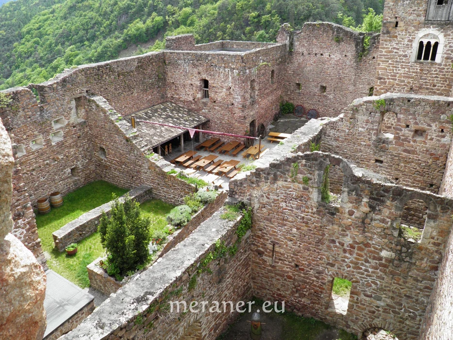 Wegverlauf: Vom Parkplatz (388 m) folgen wir kurz der Asphaltstraße, wenden uns am Gerätehaus der Feuerwehr nach links und nehmen bald darauf rechts den Weg mit der Markierung 14 und dem Hinweis „Schloss Hocheppan“. Wir gelangen auf eine asphaltierte Straße, wenden uns nach rechts und wandern auf dem neben der Straße verlaufenden Fußweg (Nr. 12) nordwärts und bald in Serpentinen durch Mischwald aufwärts. Ein Abstecher zum nahen Kreidenturm ist lohnenswert. Bald erreichen wir, stets gleichmäßig ansteigend, die Burgruine Hocheppan (636 m, Einkehrmöglichkeit in der Burgschenke im Innenhof, Mittwoch Ruhetag; ab Missian 1 Stunde). Nun folgen wir dem Hinweis „Burg Boymont“ und steigen auf einem Fußweg ziemlich steil hinab in eine Schlucht und auf dem Gegenhang steil und teilweise über Holztreppen hinauf und wandern zuerst durch Buschhänge abwärts bis zum Fahrweg und dann auf diesem wieder steil hinauf zur Burgruine Boymont (580 m, Einkehrmöglichkeit in der Burgschenke im Innenhof, Montag Ruhetag; ab Hocheppan 45 Minuten). Auf dem Zufahrtsweg (Nr. 14) wandern wir durch Laubwald und Gebüsch steil hinunter, erreichen die Fahrstraße, wenden uns nach links und nach wenigen Metern nach rechts und erreichen auf dem Hinweg wieder Missian und den Parkplatz (ab Boymont 30 Minuten).