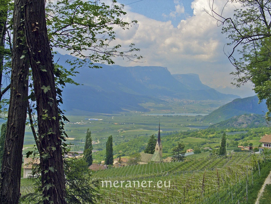 Vom Parkplatz in Vill (214 m) gehen wir kurz auf der Hauptstraße Richtung Bozen, bis gleich nach der Tankstelle ein nicht markierter Fahrweg in die Weinberge abbiegt. Wir passieren die Schranke, wandern aufwärts und biegen bei der ersten Abzweigung an einer Steinmauer nach links ab. Nun folgen wir dem Hinweis „Castelfeder“ und wandern auf urigem Weg, vorbei an Gletscherschliffen und Weihern bis zu einer Lichtung. Hier folgen wir dem Weg Nr. 5 C hinauf zum höchsten Punkt von Castelfeder (405 m; ab Vill 45 Minuten) mit den Resten früher Siedlung. Nach einem Rundgang kehren wir auf demselben Weg zur Lichtung zurück. Nun wandern wir, dem Hinweis „Montan – Pinzon“ folgend, an der Schautafel vorbei auf einem breiten Weg bis zur Asphaltstraße. Dieser folgen wir nach links hinauf bis ins Dorfzentrum von Montan (498 m; ab Castelfeder 45 Minuten; Einkehrmöglichkeiten). An der Kirche und dem Pfarrhaus vorbei steigen wir nun, dem Schild „Cislon“ folgend, durch Wald hinauf, bis wir die alte Trasse der Fleimstaler Bahn erreichen, auf der wir nach rechts weitergehen. Wir passieren einen Tunnel und nehmen vor dem mächtigen Viadukt den steilen, asphaltierten Weg Nr. 1 hinunter nach Pinzon (421 m; ab Montan 1 Stunde). Unterhalb der Kirche wandern wir auf der Asphaltstraße nach Süden, vorbei am nahen Saltnerturm. Bald erreichen wir den Wiesen- und Waldweg mit der Nr. 1 bzw. dem Hinweis „Vill“, wandern am Naturdenkmal Pinzoner und Glener Egger und einem mächtigen Wegkreuz vorbei hinunter zum Gasthaus „Rauscher“. Vom Parkplatz desselben gelangen wir auf einem Fußweg zur Hauptstraße und nach rechts zum Ausgangspunkt (ab Pinzon 1 Stunde).