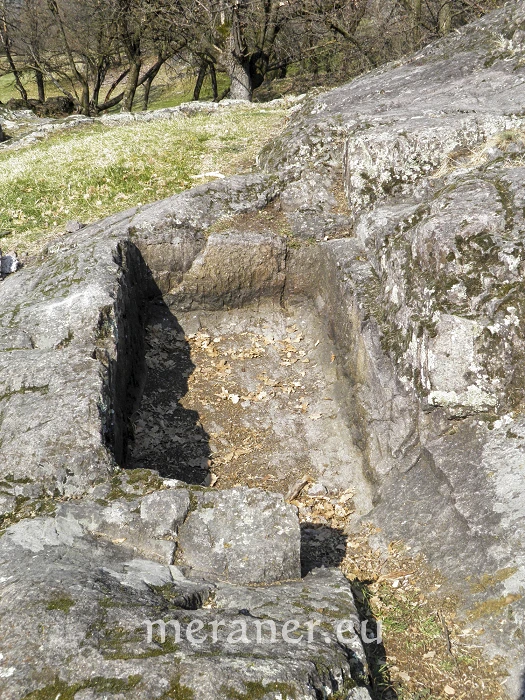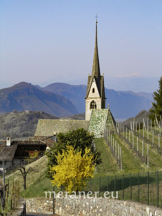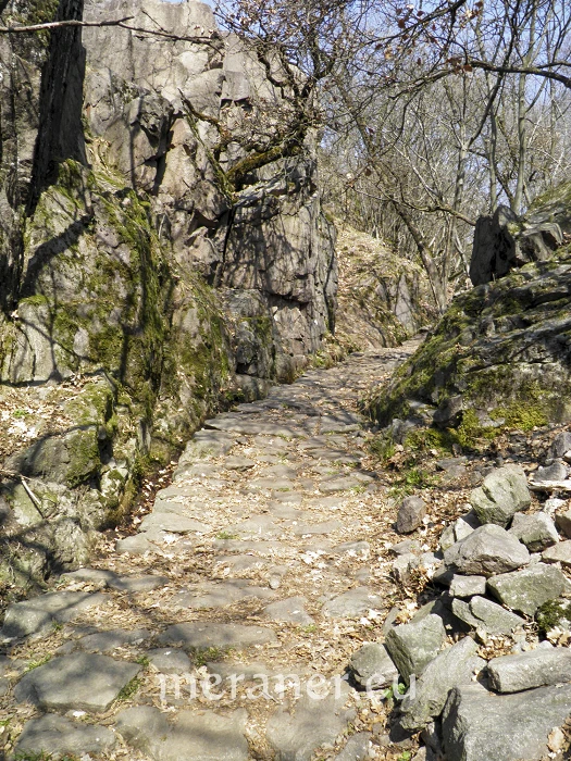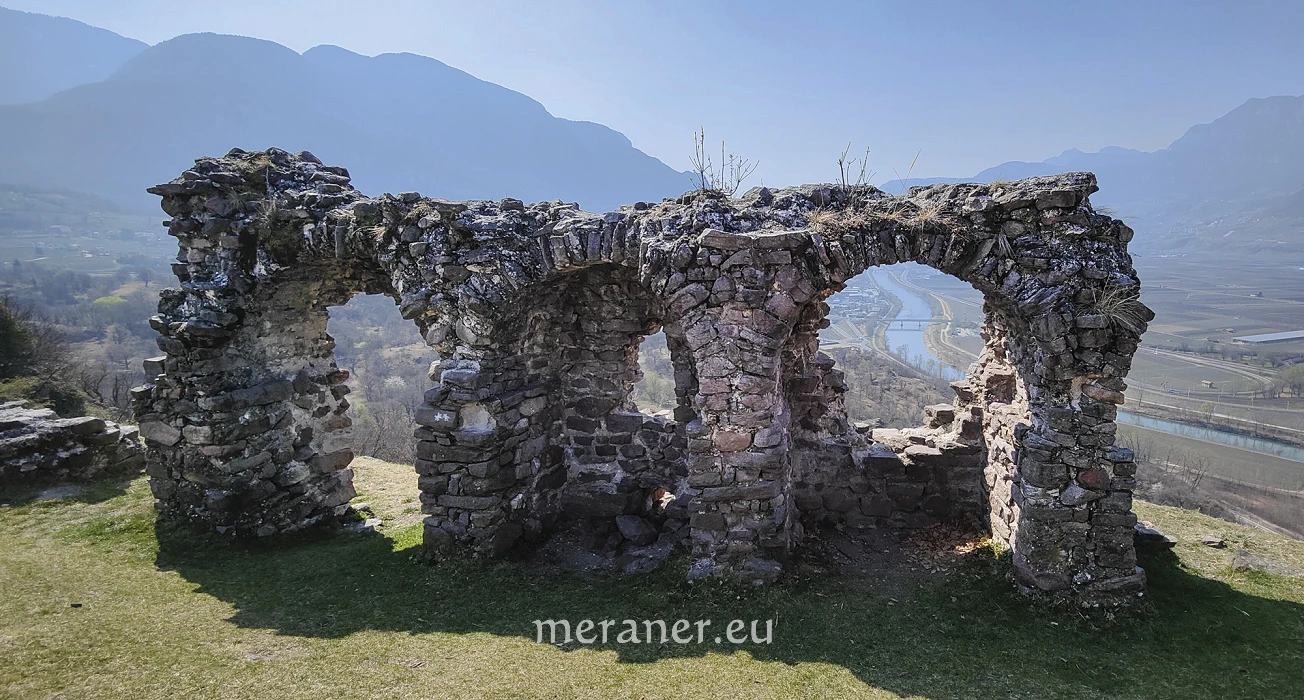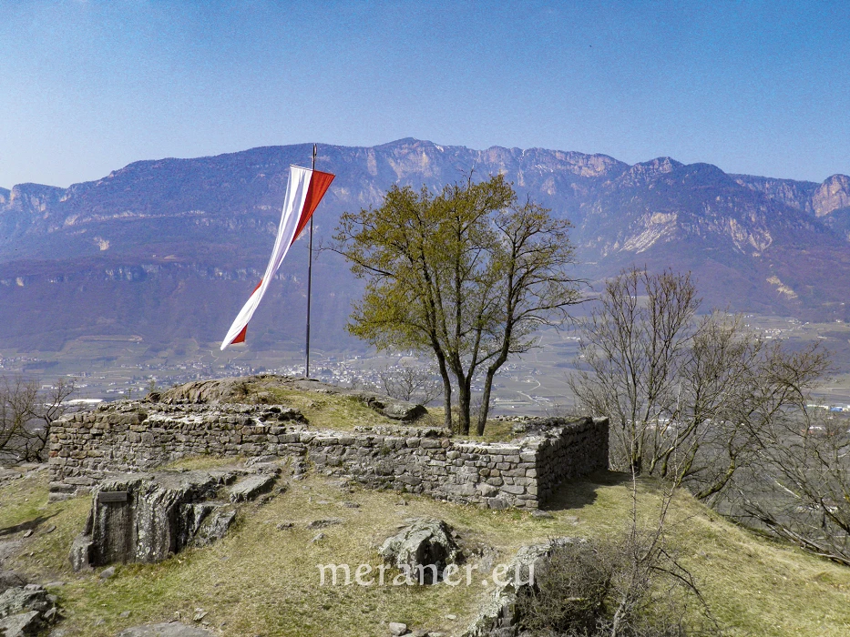 Wegverlauf: Vom Parkplatz in der Vill (214 m) gehen wir kurz auf der Hauptstraße Richtung Bozen, bis gleich nach der aufgelassenen Tankstelle ein nicht markierter Fahrweg in die Weinberge abbiegt. Wir wandern auf diesem aufwärts und biegen an einer Steinmauer nach links ab. Nun folgen wir dem Hinweis „Castelfeder“ und wandern auf urigem Weg, vorbei an Gletscherschliffen und Weihern bis zu einer Lichtung. Hier folgen wir dem Weg hinauf zum höchsten Punkt von Castelfeder (405 m; ab Vill 45 Minuten) mit den Resten früher Siedlung. Nach einem Rundgang kehren wir auf demselben Weg zur Lichtung zurück. Nun wandern wir, dem Hinweis „Montan“ folgend, an der Schautafel vorbei bis zur nächsten Weggabel, nach der wir bald links auf Weg Nr. 5C die Häuser von Montan und die Straße erreichen. Dieser folgen wir nach links hinauf bis ins Dorfzentrum von Montan (498 m; ab Castelfeder 45 Minuten; Einkehrmöglichkeiten). An der Kirche und dem Pfarrhaus vorbei steigen wir nun, dem Schild „Cislon“ (Nr. 4) folgend, durch Wald hinauf, bis wir die alte Trasse der Fleimstaler Bahn erreichen, auf der wir nach rechts weitergehen. Wir passieren einen Tunnel und nehmen vor dem mächtigen Viadukt und dem Buschenschank Planitzer (Do.-So. Einkehrmöglichkeit) den asphaltierten Weg Nr. 1 hinunter nach Pinzon (421 m; ab Montan