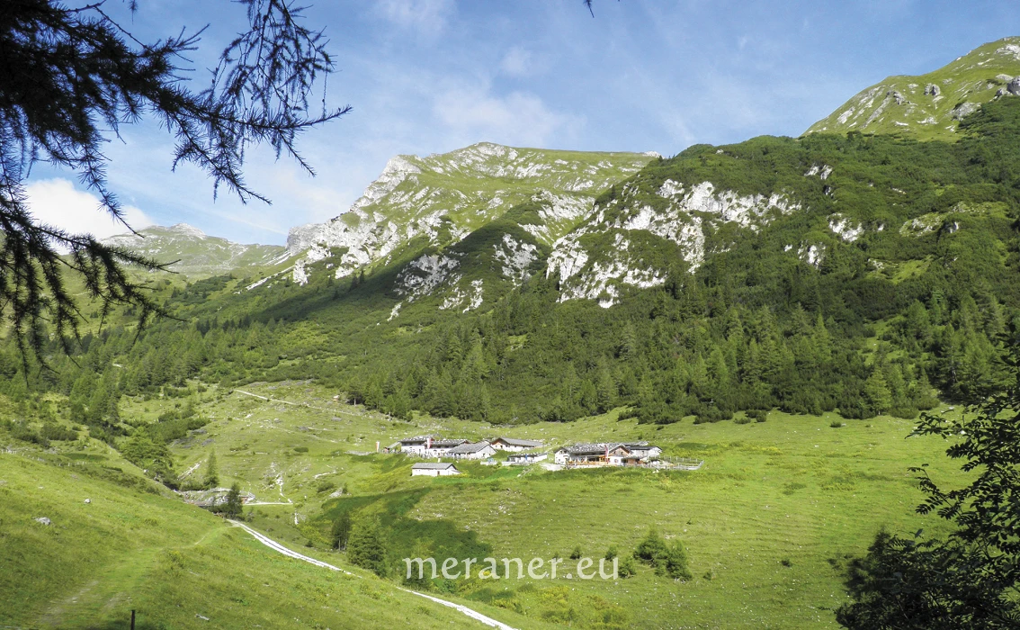 Unter den schroffen Felswänden der Telfer Weißen bilden im Vallmingtal die drei Almhütten Jörgner Kaser, Baron Kaser und Walter Kaser eine Hüttengemeinschaft, ein regelrechtes Dorf, was bei uns in Südtirol eine Seltenheit ist.
