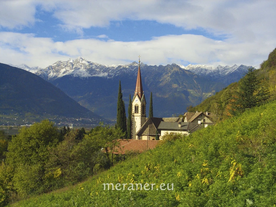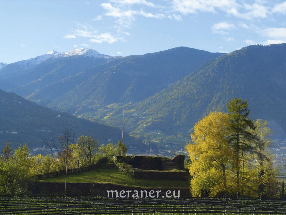 Vom Wanderweg reicht unser Blick über das Etschtal bis zur Texelgruppe mit ihren markanten Gipfeln. Der Weg führt oberhalb des Dorfes Burgstall durch die ostseitigen Hänge, die zum Tschögglberg ansteigen, und gewährt einen besonders schönen Blick auf die von Zypressen flankierte Kirche, die in ihren Ursprüngen auf eine im Jahr 1330 von Graf Volkmar erbaute Kapelle zurückgeht. Um 1500 entstand dann ein gotischer Bau, deren Turm und Chor heute noch erhalten sind, und gegen Ende des 19. Jahrhunderts erhielt die Kirche ihre heutige neuromanische Form. In der Nähe befindet sich die Burgruine von Burgstall. Die Burg wurde um 1300 von den Herren von Burgstall erbaut. Nachdem sie 1348 bei kriegerischen Auseinandersetzungen zerstört wurde, blieb sie eine Ruine. Am Weg befindet sich auch der Wiedn-Keller. Einst wohl als Keller der Burg erbaut, diente er später den Geistlichen, um Speck und Wein kühl zu lagern – daher der Name. Dahinter verbirgt sich vermutlich ein Eisloch; die kalte Luft, die dem Wanderer durch das Kellerfenster entgegenweht, spricht für die Vermutung.