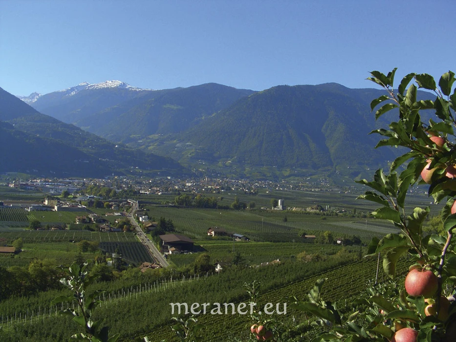 Rückweg: Wir wenden uns nach links und gelangen auf dem Gehsteig entlang der Straße zurück zum Ausgangspunkt (ca. 30 Minuten). Von der Haltestelle bei der Firma Vacon können wir auch mit dem Linienbus Meran-Bozen zum Ausgangspunkt zurückkehren.