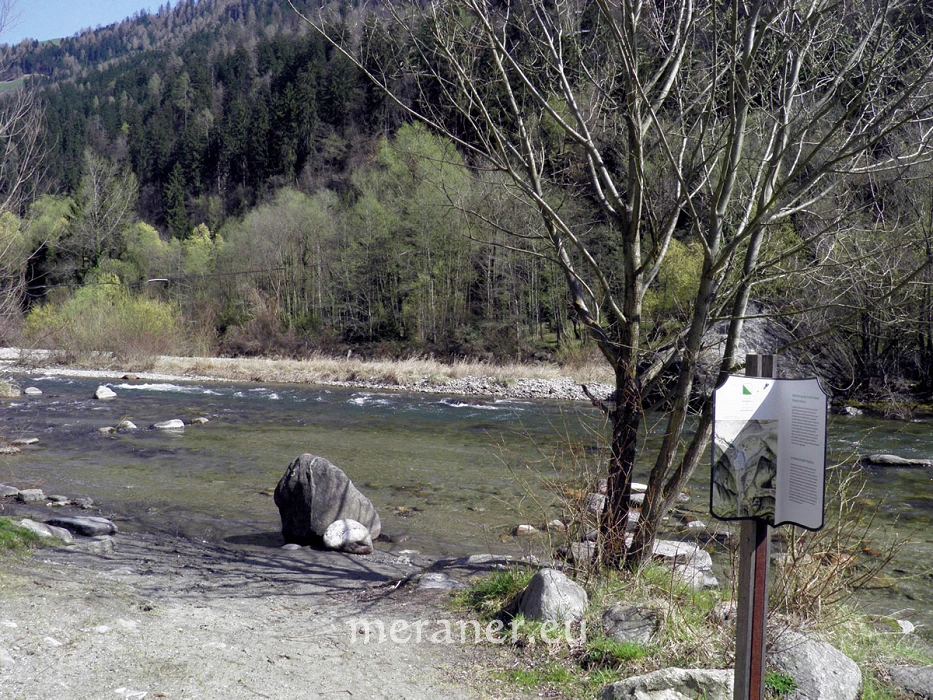 Besonderheiten: Der Weg beginnt am unübersehbaren Schildhof (und Hotel) Saltaus. Dieser gilt als der älteste im Tal und diente bereits im 13. Jahrhundert als Zollstation der Grafen von Tirol. Der Rundweg führt noch an den zwei Schildhöfen Haupold und Granstein vorbei. Verschiedene Stationen informieren über Besonderheiten der Schildhöfe und über interessante Themen. Sieben Herren aus dem Passeiertal wurden 1317 mit besonderen, adelsgleichen Rechten ausgestattet und bekleideten höhere Ämter beim Zoll, bei Gericht und in der Verwaltung. Ihre besondere Stellung betonten sie auch mit der besonderen Bauweise ihrer Ansitze, den Schildhöfen. Im 17. Jahrhundert kamen vier weitere Personen in den Genuss besonderer Privilegien. Als Gegenleistung mussten die elf Schildhöfler bewaffneten Kriegsdienst leisten, waren dafür aber von jeglichen Steuern und Abgaben befreit. Sie hatten Jagd- und Fischereirechte wie Adelige und führten ein Siegel für Urkunden. Mit der Verlegung der Tiroler Landesregierung von Schloss Tirol nach Innsbruck sank zwar die Bedeutung der Schildhofherren, aber die Sonderrechte blieben bestehen, auch als die Höfe an gewöhnliche Bauern übergingen. Erst durch eine Verordnung Kaiser Josef II. im 18. Jahrhundert erloschen die Sonderrechte, nur das Fischereirecht ist bis heute geblieben sowie das Recht, sich an hohen Festtagen mit Schild und Hellebarde zu wappnen.