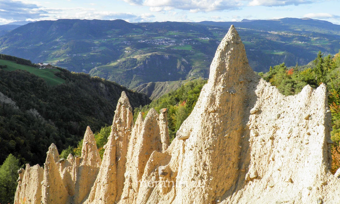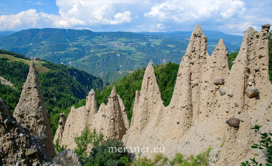Besonderheiten: Das sonnige Höhendorf Steinegg ist unter anderem wegen seiner Erdpyramiden bekannt. Durch den Kalkgehalt sind sie sehr hell gefärbt und stechen inmitten der Bäume deutlich hervor. Es sind insgesamt ca. 50 Türme mit bis zu 20 m Höhe. Viele, vor allem die größten von ihnen, tragen keine Decksteine mehr, die schützenden Steine sind nur noch vereinzelt vorhanden. Die Sage besagt, dass sich einst an ihrer Stelle große Wiesen ausbreiteten, die aber nach dem Meineid eines Bauern eines Nachts abrutschten – und übrig blieben die Erdsäulen, wie die zum falschen Schwur erhobenen Finger des Bauern.