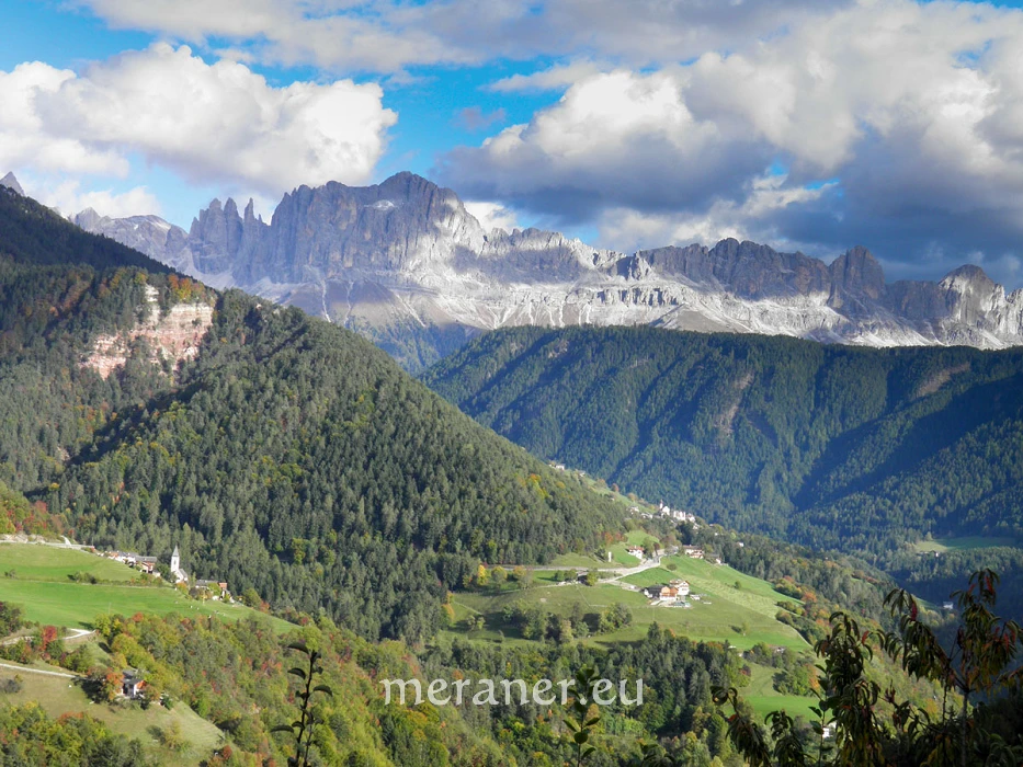 Vom Wanderweg blicken wir auf den Rittner Höhenrücken, auf Völser Aicha, einen Ortsteil der Gemeinde Völs am südlichen Rand der Prösler Hochfläche, und auf den Rosengarten.