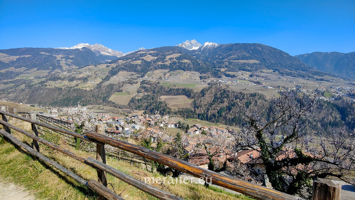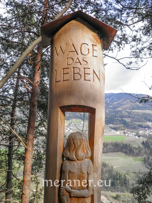 Wegverlauf: Vom Parkplatz (502 m) gehen wir auf der Hauptstraße wenige Meter Richtung Dorfzentrum, wenden uns nach dem Hotel „Kreuz“ nach links und folgen dem Hinweis „Besinnungsweg“. Nach wenigen Minuten biegen wir links in den Valtmaunweg (= Fußweg) ein und wandern zwischen Obstgütern und Häusern hinein ins schluchtartige Valtmauntal und dann an Bauernhäusern und am Hilberkeller (Einkehrmöglichkeit, Dienstag Ruhetag) vorbei auf der Straße hinauf zur Kirche von Kuens (595 m; ab Riffian ca. 45 Minuten). Nun gehen wir kurz auf der Kuenser Straße weiter, biegen über eine Brücke (610 m) rechts ab, kommen an einem Appartementhaus und an einem Bauernhaus vorbei und wandern dann auf dem weitgehend eben verlaufenden Weg teils durch steile Waldhänge, teils durch Obstgüter nordwärts. (An der Weggabel bei der Stele „Sechster Schmerz“ kann man auf breitem Weg direkt zur Kirche absteigen.) Wir wandern auf dem Fußweg weiter nordwärts durch den Wald bis zu einer Weggabel mit dem Namen „Puenofen“. Hier steigen wir auf dem Weg Nr. 5 mit dem Hinweis „Riffian“ etwas steil bergab, erreichen das „Hammele Kreuz“, wenden uns nach rechts und erreichen die Wallfahrtskirche von Riffian (ab Kuens 1½ Stunden; ab Ostern Einkehrmöglichkeit im Cafè Weingut unterhalb der Kirche). Auf der Straße kehren wir in ca. 20 Minuten zum Ausgangspunkt zurück.