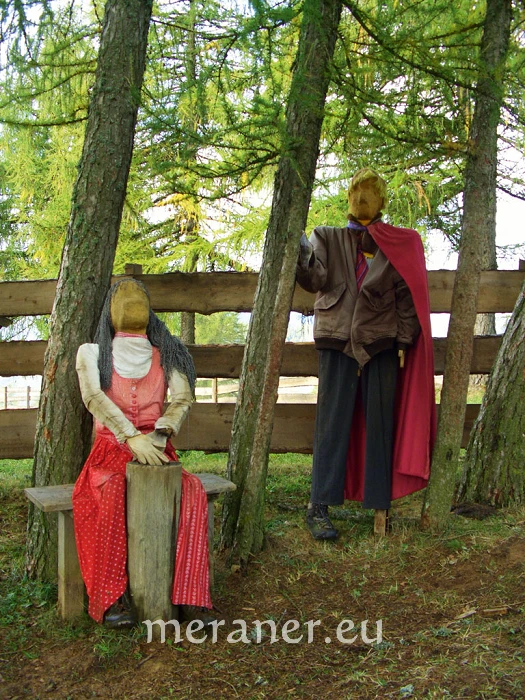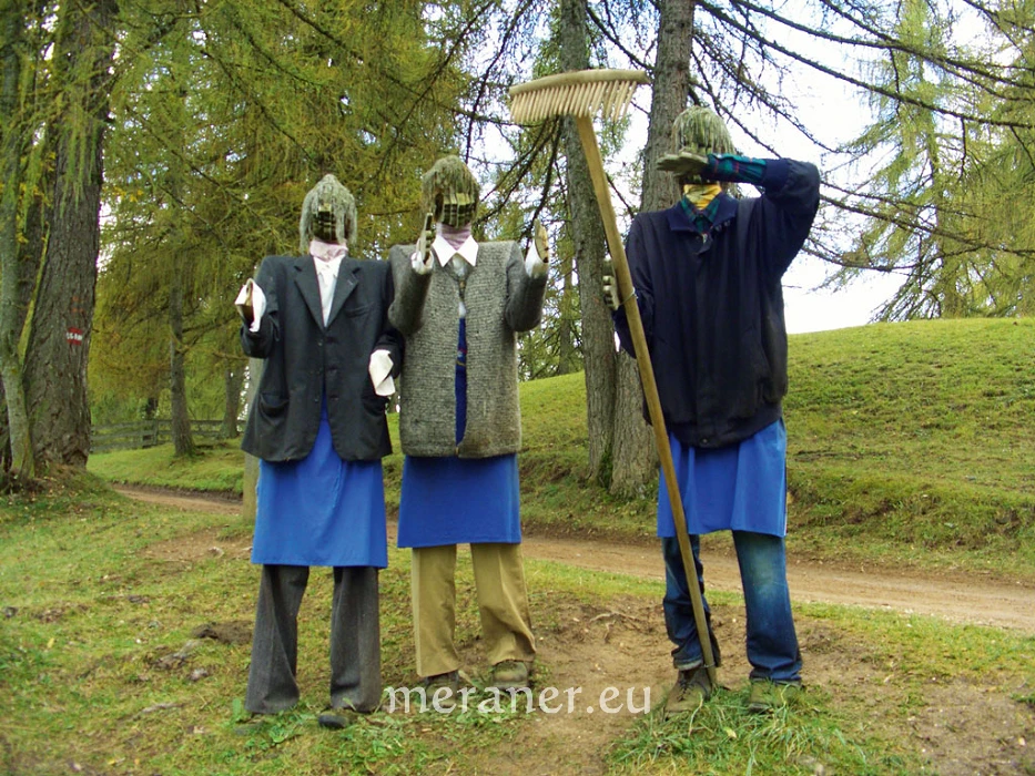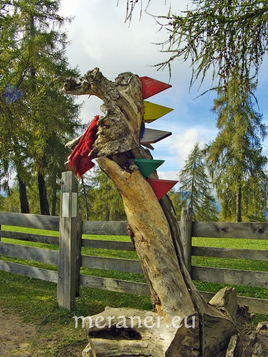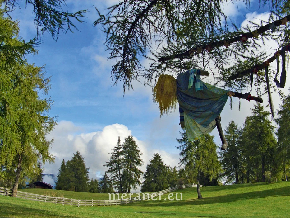 Besonderheiten: Wir besuchen auf dieser Wanderung den Salten, der auch als Reich der Lärchen gilt. Lichte Lärchenwiesen, die im Herbst in allen Gelb-, Orange- und Brauntönen erstrahlen, und weitreichende Rundblicke auf die Bergwelt der Dolomiten, der Sarntaler Alpen und sogar bis zum Ortler erfreuen unser Herz. Der Sagenweg wurde von den Schulkindern der Grundschule Jenesien angelegt und beschäftigt sich mit Sagen der Umgebung. Die Figuren sind aus verschiedenen Materialien – vor allem Holz und Stoff – liebevoll gestaltet. Die jeweilige Sage wird auf Schildern anschaulich erzählt. Insgesamt sind neun Sagen dargestellt. Die einzelnen Schupfen – die kleinen Hütten, für die der Salten ebenso bekannt ist – liegen hinter Bäumen versteckt und immer wieder begegnen wir am Weg den einzelnen Stationen mit ihren Sagen: „Das endlose Knäuel“, „Die Butterhexe von Afing“, „Wie Schloss Greifenstein zu seinem Namen kam“, „Die versunkene Stadt“ oder „Tille, die gefangene Meerjungfrau“.