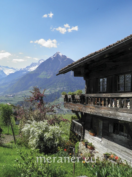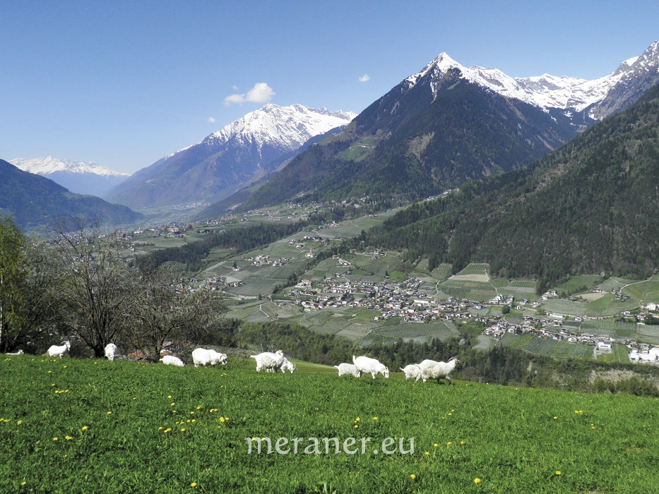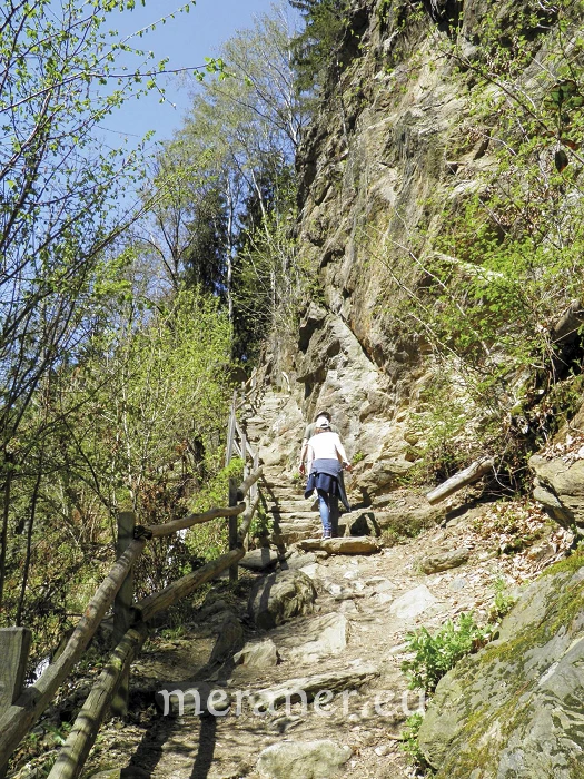 Wegverlauf: Von der Haltestelle (ca. 660 m) gehen wir auf dem Gehsteig der Verdinser Straße hinauf bis zum Hotel Ifinger, dort überqueren wir die Straße und wandern, den Hinweisen „Schenner Waalweg“ und „Talstation Taser“ und der Markierung Nr. 20 folgend, zwischen den Häusern hinauf zu den freien Wiesen und erreichen den Gasthof Pichler (826 m, Einkehrmöglichkeit, Dienstag Ruhetag; ab Schenna 45 Minuten) und die Talstation der Seilbahn zum Taser. Nun wenden wir uns nach rechts, gehen wenige Meter auf der Straße abwärts und biegen links in den Waalweg. Auf diesem wandern wir südwärts, wobei wir einmal über die „Katzenleiter“, eine längere Natursteintreppe, absteigen, am Buschenschank Brunjaunhof (782 m, Einkehrmöglichkeit) vorbeikommen und schließlich in die Nähe von St. Georgen gelangen. Hier biegen wir vom Waalweg rechts ab und erreichen auf der Straße (Nr. 18) den Weiler St. Georgen (716 m, Einkehrmöglichkeiten: Georgenhof und Moserhof; ab Gasthof Pichler 40 Minuten). In St. Georgen folgen wir dem Hinweis „Wiesenweg“ und wandern zuerst etwas steil auf einem schmalen Fußpfad und dann auf der Straße bergab. Kurz bevor wir zu einer Kurve der St.-Georgen-Straße gelangen, biegen wir rechts in den Bloseggweg (neulich lehnte das Hinweisschild an der Mauer), wandern leicht ansteigend und dann eben nordwärts zur Straße, auf dieser kurz bergab und dann wieder rechts ab (Hinweis „Wiesenweg“), vorbei am Loth-Hof, zu einer Straße. Auf dieser gehen wir abwärts und erreichen das erste Wegstück der Wanderung, auf dem wir zur Bushaltestelle zurückkehren (ab St. Georgen 50 Minuten).