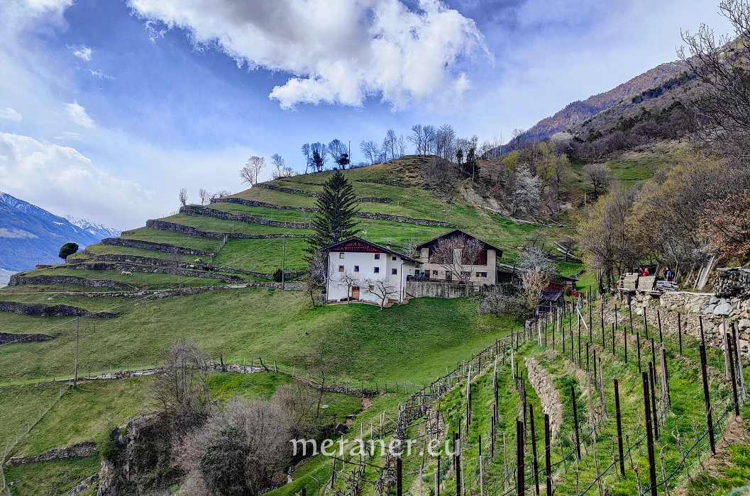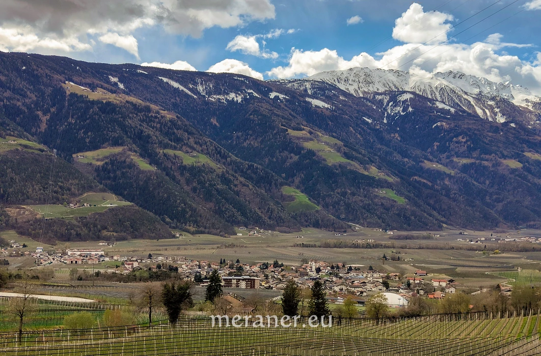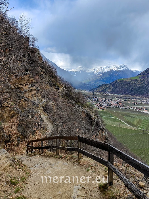 Wegverlauf: Von der Bushaltestelle folgen wir dem Hinweis „Sonnenberger Panoramaweg“ und der Markierung Nr. 91, gehen die Dorfstraße hinauf bis zum Hotel Stachelburg, wo wir links abbiegen und bald durch Obstwiesen westwärts wandern. Auf einer Hängebrücke überqueren wir den Zielbach und gelangen zum „Winklerhof“ (642 m, Einkehrmöglichkeit, Mittwoch Ruhetag). Nun führt der Wanderweg Nr. 91, mal leicht an- und absteigend, mal auch etwas steiler quer durch den Rablander und Naturnser Sonnenberg, vorbei am Pardellhof (670 m), am Hof Weitgrub und am Buschenschank „Weinberghof“ (Einkehrmöglichkeit, Montag Ruhetag) bis nach Naturns (554 m, ab Partschins 2½ Stunden).