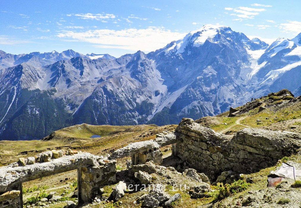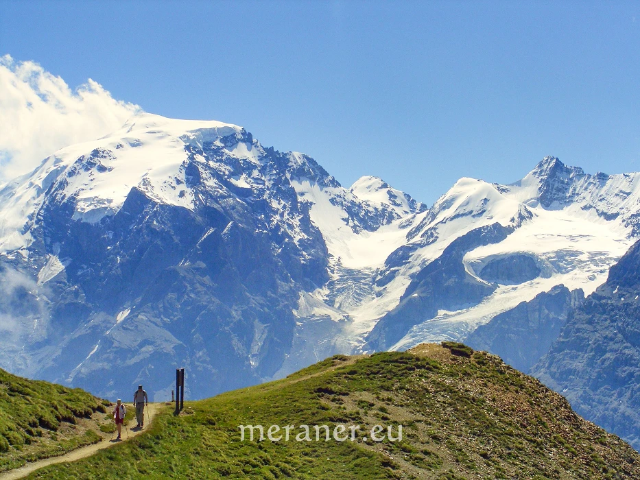 Besonderheit: Das Stilfser Joch, der Straßenübergang von Trafoi nach Bormio im Veltlintal, ist ein Sommerskigebiet. Die bereits 1825 mit 48 Kehren angelegte Straße ist die zweithöchste Passstraße der Alpen. Auf der Dreisprachenspitze kann man einen Rundblick genießen, den man nicht so schnell vergisst. Hier treffen Südtirol, die Provinz Sondrio und der Kanton Graubünden aufeinander. Im ersten Abschnitt des Weges vermitteln die noch vorhandenen Schützengräben und Unterstände und mehrere Schautafeln Eindrücke menschlicher Leistungen und Leiden im Ersten Weltkrieg. Insgesamt informieren 14 Schautafeln entlang des Weges über den Krieg, die Entstehung der Gesteine und den Überlebenskampf der Pflanzen in der unwirtlichen Umgebung. Vom Wanderweg und von der Furkelhütte genießen wir beeindruckende Prachtblicke zum Ortler und seinen Nachbarn.