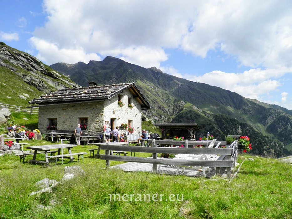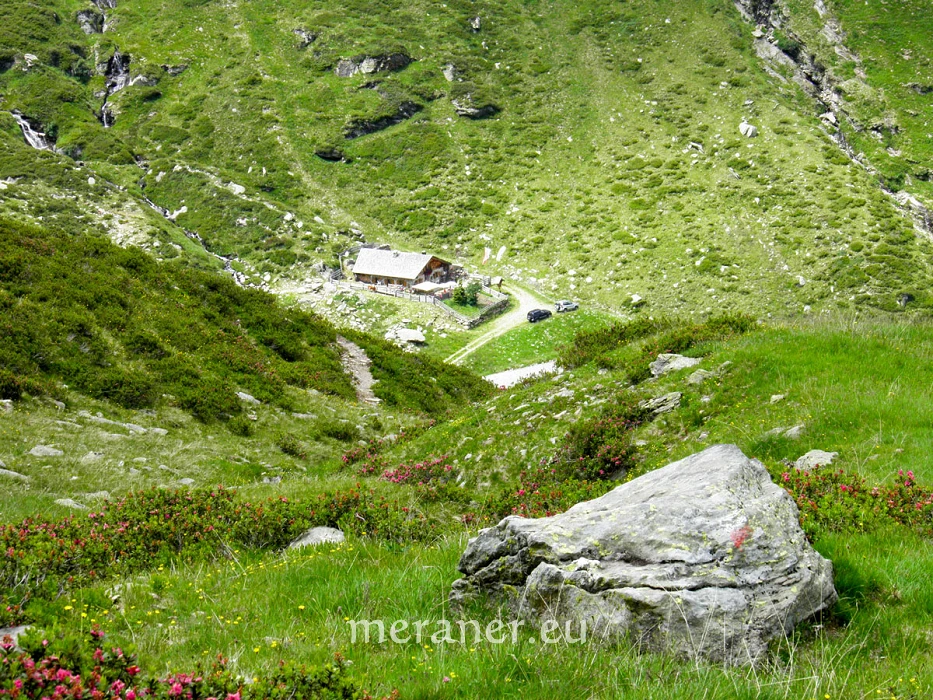 Anfahrt: Ins Passeiertal bis Kalmtal, einem Ortsteil der Gemeinde St. Martin; vor der gut sichtbaren Brücke, rund 2 km vor St. Martin, zweigt links die Kalmtalstraße ab, auf der wir nach ca. 6 km das Gasthaus „Magdfeld“ (Montag Ruhetag) erreichen. Auf der rechts weiterführenden, guten, nicht geteerten Straße weiter taleinwärts bis zu einem Parkplatz nahe den Rappenhöfen (ca. 1.280 m; ab Magdfeld 1 km).