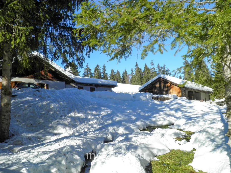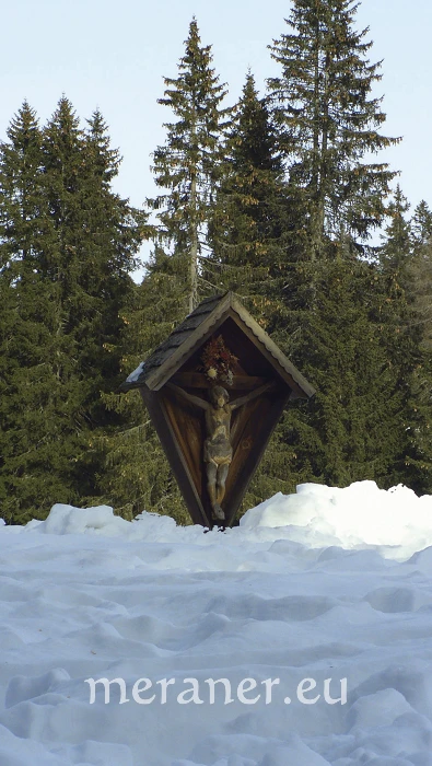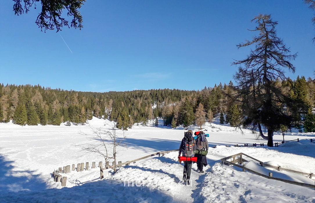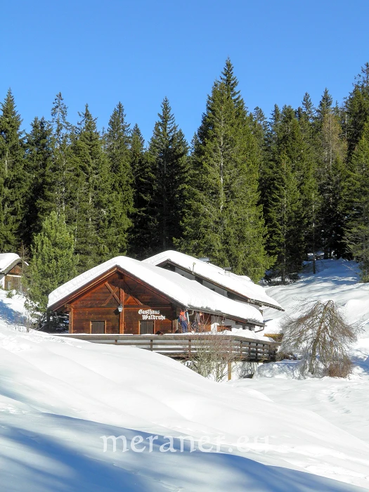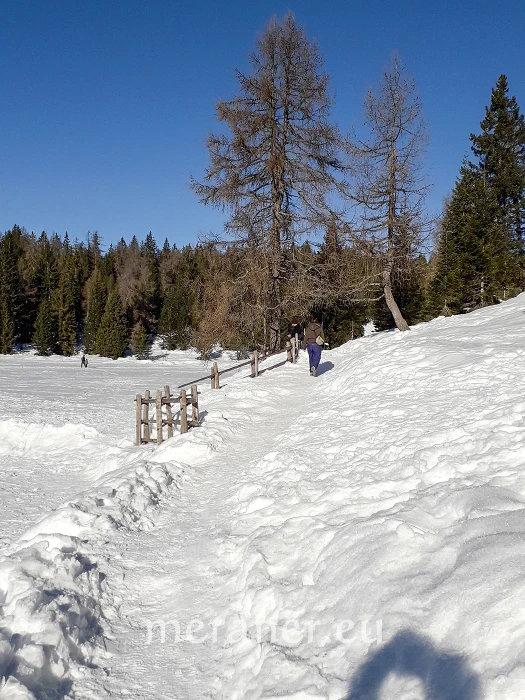 Wegverlauf: Vom Parkplatz wandern wir auf der breiten, gebahnten Forststraße mäßig ansteigend durch lichten Wald und Wiesen aufwärts. In einer Linkskurve folgen wir rechts dem ausgetretenen Fußweg, auf dem wir, weiterhin ansteigend, den Felixer Weiher (1.604 m; auch Tretsee) erreichen. Nun wenden wir uns nach rechts und folgen dem ausgetretenen Fußweg, der um den zugefrorenen und schneebedeckten See führt. Am Nordende des Sees erreichen wir den Fußweg (Nr. 9), von dem wir vorhin nach rechts abgebogen sind. Wir wenden uns nach rechts und gelangen zum Gasthaus Waldruhe, das im Winter geschlossen ist. An diesem vorbei erreichen wir nach wenigen Minuten die Felixer Alm (1.632 m; Einkehrmöglichkeit am Samstag und Sonntag und in den Schulferien; ab Parkplatz mit Seeumrundung 90 Minuten).