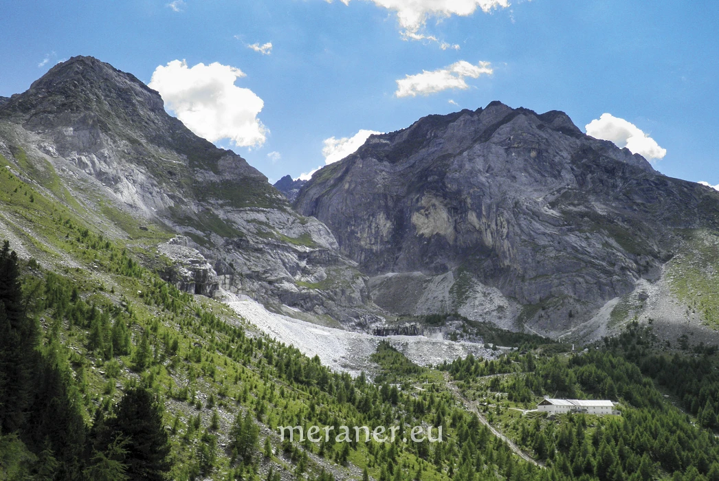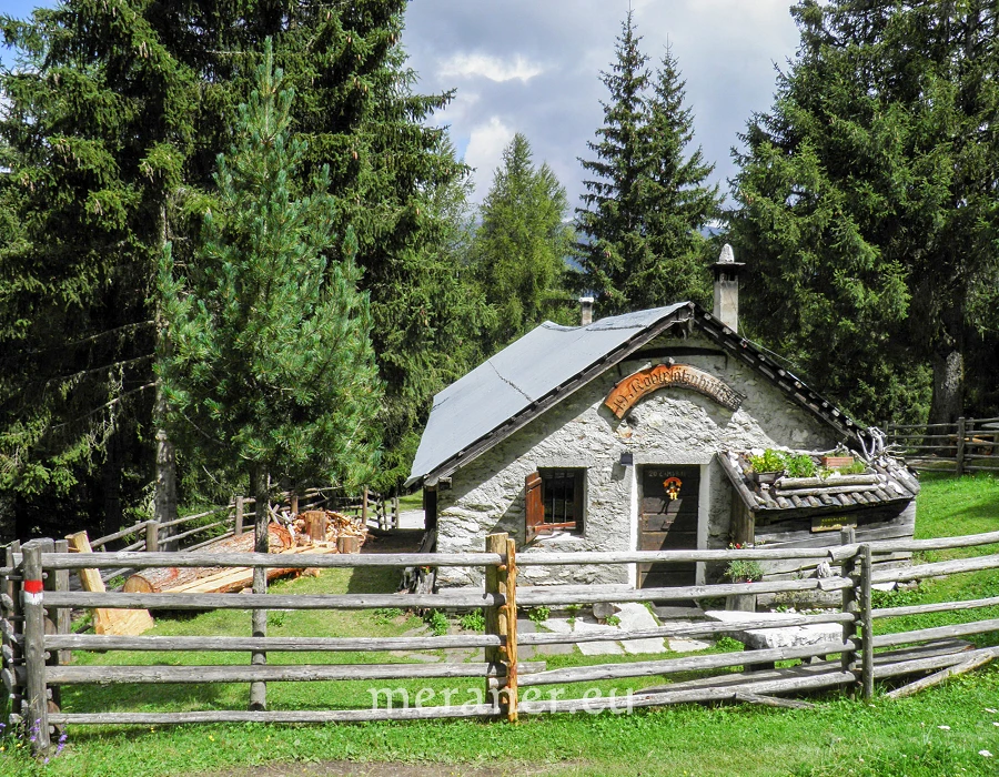 Wegverlauf: Vom Haslhof (1.550 m, Einkehrmöglichkeit) wandern wir auf dem Steig Nr. 1 durch Wiesen hinauf zum Wald und dann durch diesen ziemlich steil weiter bergauf zum Kreuzjöchl (2.053 m; Übergang ins Martelltal). Hier wenden wir uns nach rechts und steigen auf dem Marteller Höhenweg (Nr. 23) zuerst durch Lärchenbestände und bald über freie Wiesenhänge und am Kamm entlang hinauf zum Göflaner Schartl (2.396 m; ab Haslhof 2½ Stunden). Auf dem Steig Nr. 3A wandern wir in Serpentinen steil, aber unschwierig bergab, vorbei am Göflaner Marmorbruch und entlang des Göflaner Marmor-Themenweges (Nr. 3) zur Göflaner Alm (1.826 m, Einkehrmöglichkeit; ab Göflaner Schartl 1½ Stunden). Nun wandern wir auf dem breiten Weg bis zum Rand der Almwiesen und dann rechts auf dem neu angelegten Waldweg hinunter zur Kohlplätzenhütte (1.666 m, keine Einkehrmöglichkeit). Hier wenden wir uns nach rechts und kehren auf dem teils breiten, teils schmalen Weg Nr. 2 in langer Querung der Waldhänge, vorbei an der aufgelassenen Weißkaser Alm (1.649 m), zurück zum Haslhof (ab Göflaner Alm 1½ Stunden).