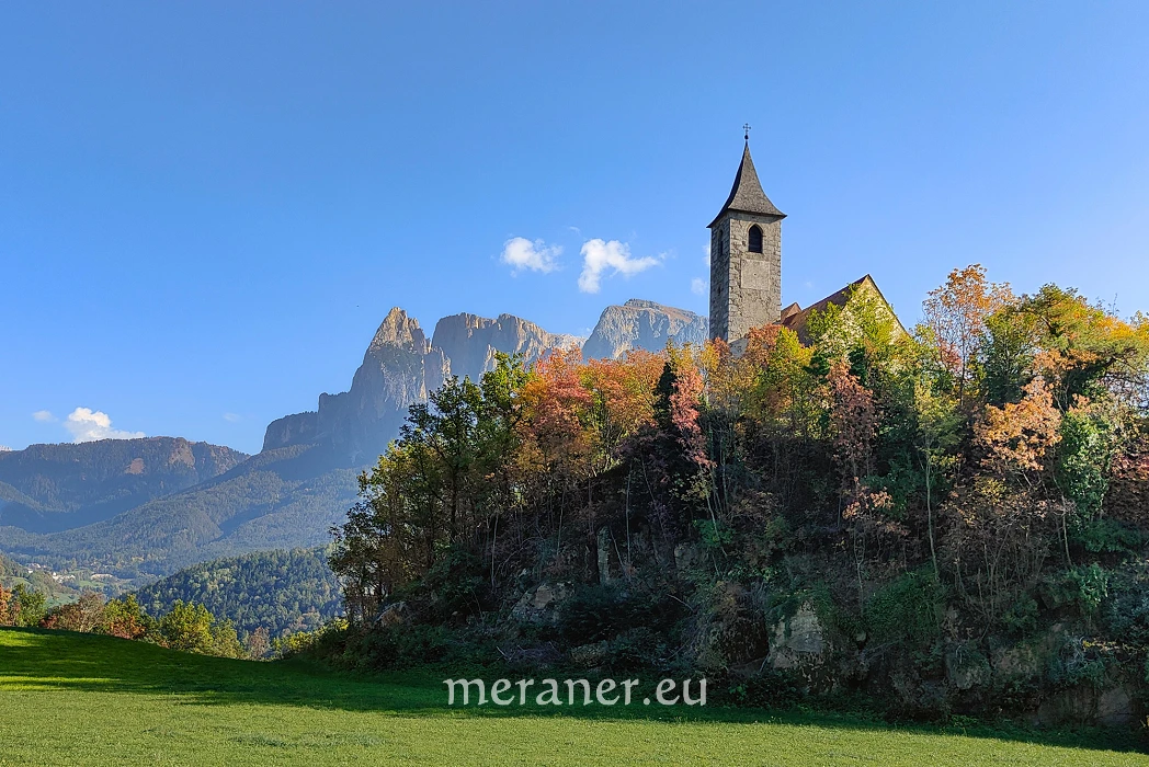Von unserem Wanderweg können wir immer wieder besondere Ausblicke genießen. Die Gipfel der westlichen Dolomiten, besonders der Schlern, zeigen sich uns in ihrer ganzen Pracht.