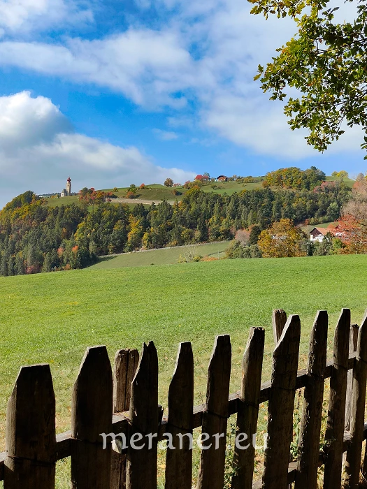 entlang hinaufführt zum Haidgerberhof (1.060 m; Hofschank nicht mehr in Betrieb). Nun wenden wir uns nach rechts und erreichen auf Weg Nr. 8 in wenigen Minuten den Hexenboden (1.075 m; ab Lengstein 30 Minuten). Auf dem breiten Weg Nr. 8 wandern wir hinunter zum Zargenwalderhof und weiter (Nr. 8A) teils auf Fußwegen, teils auf Höfezufahrten durch Wiesen und Wald hinunter zur Straße und kurz rechts zum Hof Penzl an der „Kaiserstraße“ (850 m; ab Hexenboden 30 Minuten). Nun folgen wir dem Hinweis „St. Verena“ und gelangen auf dem Stationenweg zuerst eben und dann leicht ansteigend zur Höhenkirche St. Verena (889 m; ab Penzl 20 Minuten). Auf dem Hinweg kehren wir zum Penzl zurück und wandern ca. 500 m auf der geteerten Kaiserstraße südwärts, biegen beim Braunhof links ab und gelangen auf dem „Keschtnweg“ (teils Höfezufahrten, teils Fußweg) zum Zunerhof