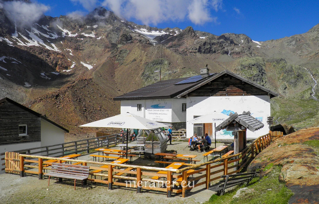 Wegverlauf: Von Weißbrunn (1.872 m) wandern wir auf dem Weg Nr. 140 zuerst leicht und dann über die freien Hänge stark ansteigend hinauf zur Höchster Hütte (2.561 m; ab Weißbrunn 2 Stunden), die in schöner Lage am aufgestauten Grünsee steht.