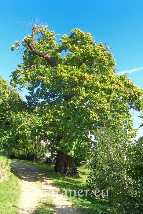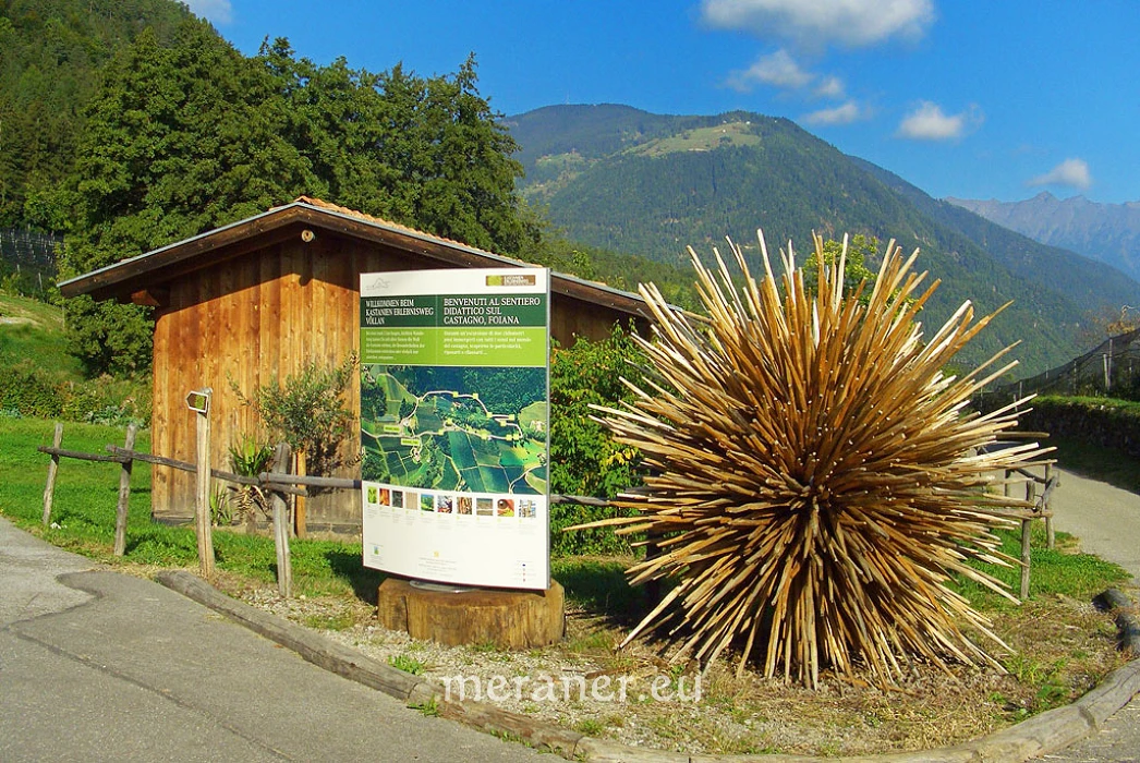 Dieser Lehrpfad führt mitten durch traditionell bewirtschaftete Kastanienhaine und gewährt auch sehr schöne Ausblicke in den Talkessel und die Bergwelt von Meran. Auf dem ca. 2 km langen Rundweg erfahren wir an zehn Erlebniselementen viel Interessantes und Wissenswertes. Jede dieser Stationen versucht ein ganz bestimmtes Thema rund um die Kastanie ansprechend zu vermitteln.