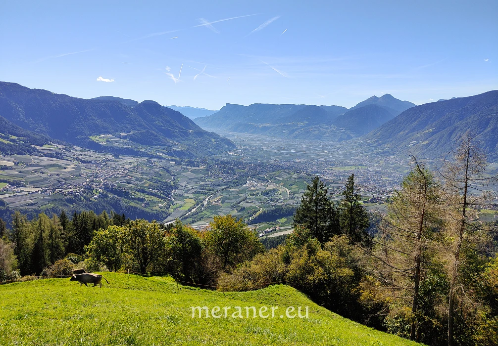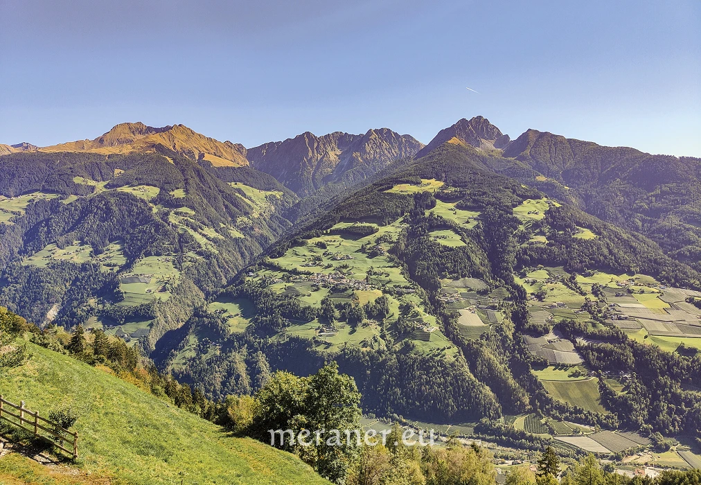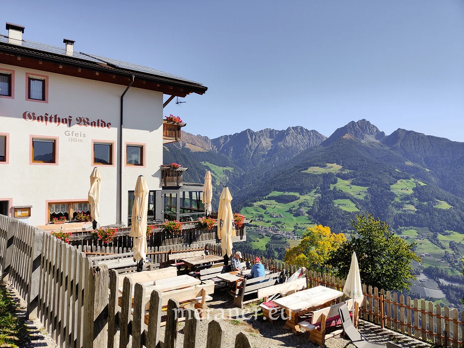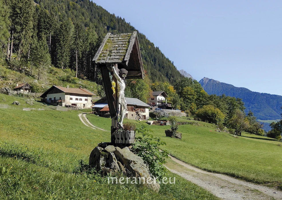 Wegverlauf: Beim Bauernhof Mutlechner (837 m) beginnt der Steig Nr. 21, auf dem wir durch den Wald, vorbei an zwei Wetterkreuzen und an den Kuenser Erdpyramiden, ziemlich steil bergan steigen und den Meraner Höhenweg erreichen (Rastbank und herrliche Aussicht). Nun folgen wir dem Hinweis „Gasthof Walde“ und gelangen kurz durch Wald und dann über einen breiten Wiesenweg zum Gasthof Walde (1.310 m, Einkehrmöglichkeit bis Anfang November und dann noch an zwei Wochenenden, Donnerstag Ruhetag; ab Parkplatz 1½ Stunden), der zum Weiler Gfeis gehört. Nach einer Rast kehren wir zurück bis zum Waldrand, wo rechts der Weg Nr. 27 B abzweigt, auf dem wir bald den mit Nr. 24 markierten Meraner Höhenweg erreichen und folgen diesem westwärts, die steilen Waldhänge querend, bis zum Gasthof Longfall (1.075 m, Einkehrmöglichkeit ganzjährig, Freitag Ruhetag; ab Gasthof Walde 1 Stunde) im Spronser Tal. Gleich unter dem Gasthof führt uns ein Steig (Einstieg bei Gitter im Zaun) durch die Wiesen und dann kurz durch Wald hinab zum Beginn des Kuenser Waales (1.020 m). Nun wandern wir den Waalweg entlang bis dieser in den Weg Nr. 21 mündet, auf dem wir zum Parkplatz zurückkehren (ab Longfall 1 Stunde).