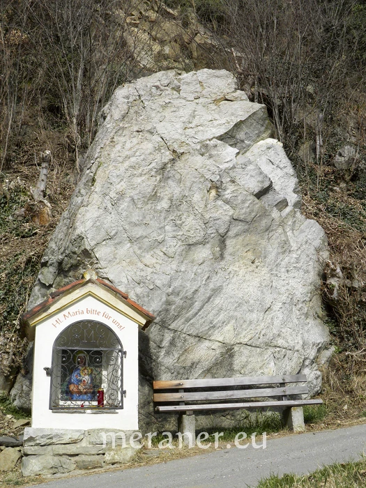 Wegverlauf: Wir wandern von der Postbrücke auf dem orografisch linken Ufer der Passer, vorbei am nahen Sissi-Denkmal, auf der Sommerpromenade Richtung Gilf, unterqueren den Steinernen Steg und gelangen in die Gilf. Nun steigen wir kurz vor der Brücke die Treppen des Margarethenweges hinauf und wandern auf dem breiten Rad- und Wanderweg hinein zum Auwald-Biotop und zum großen Fischteich in der Lazag. Dem breiten Weg folgend, erreichen wir eine Brücke, auf der wir auf die orografisch rechte Seite der Passer gelangen. Entlang der Passer wandern wir nun weiter nach Norden. Gleich nach der Brücke über den Finelebach wenden wir uns nach links und folgen der asphaltierten Straße (Hinweis: Dorf Tirol und Kuens) bergauf bis zu einem auffallenden Bildstock unterhalb eines Felsens. Hier wenden wir uns nach links, überqueren auf der „Oachholzbrücke“ erneut den Finelebach und steigen dann auf einem Fußweg (Nr. 5A) in Serpentinen hinauf zur Passeirer Straße. Diese überqueren wir und erreichen auf dem ansteigenden, asphaltierten Aichweg, vorbei an der Ruprechtskirche, die Hauptstraße von Dorf Tirol in der Nähe des Vereinshauses. Auf dieser wandern wir nun durch den unteren Teil des Dorfes abwärts, biegen an einer Straßenkreuzung in den Segenbühelweg und folgen diesem bis zum Beginn des Tirolersteiges, der rechts abzweigt. Auf diesem Fußweg (Nr. 6) wandern wir den Küchelberg hinunter zum Tappeinerweg. Hier steigen wir teils über viele Treppen und teils auf altem Pflasterweg direkt hinunter zur Pfarrkirche von Meran. Auf der Leonardo-da-Vinci-Straße erreichen wir durch das Bozner Tor den Sandplatz und die Postbrücke, wo sich der Kreis schließt.