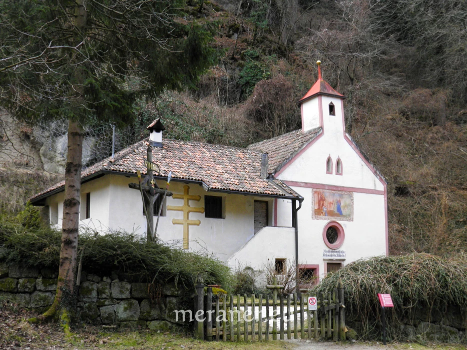Wegverlauf: Wir wandern von der Postbrücke auf dem orografisch linken Ufer der Passer, vorbei am nahen Sissi-Denkmal, auf der Sommerpromenade Richtung Gilf, unterqueren den Steinernen Steg und gelangen in die Gilf. Nun steigen wir kurz vor der Brücke die Treppen des Margarethenweges hinauf und wandern auf dem breiten Rad- und Wanderweg hinein zum Auwald-Biotop und zum großen Fischteich in der Lazag. Dem breiten Weg folgend, erreichen wir eine Brücke, auf der wir auf die orografisch rechte Seite der Passer gelangen. Entlang der Passer wandern wir nun weiter nach Norden. Gleich nach der Brücke über den Finelebach wenden wir uns nach links und folgen der asphaltierten Straße (Hinweis: Dorf Tirol und Kuens) bergauf bis zu einem auffallenden Bildstock unterhalb eines Felsens. Hier wenden wir uns nach links, überqueren auf der „Oachholzbrücke“ erneut den Finelebach und steigen dann auf einem Fußweg (Nr. 5A) in Serpentinen hinauf zur Passeirer Straße. Diese überqueren wir und erreichen auf dem ansteigenden, asphaltierten Aichweg, vorbei an der Ruprechtskirche, die Hauptstraße von Dorf Tirol in der Nähe des Vereinshauses. Auf dieser wandern wir nun durch den unteren Teil des Dorfes abwärts, biegen an einer Straßenkreuzung in den Segenbühelweg und folgen diesem bis zum Beginn des Tirolersteiges, der rechts abzweigt. Auf diesem Fußweg (Nr. 6) wandern wir den Küchelberg hinunter zum Tappeinerweg. Hier steigen wir teils über viele Treppen und teils auf altem Pflasterweg direkt hinunter zur Pfarrkirche von Meran. Auf der Leonardo-da-Vinci-Straße erreichen wir durch das Bozner Tor den Sandplatz und die Postbrücke, wo sich der Kreis schließt.