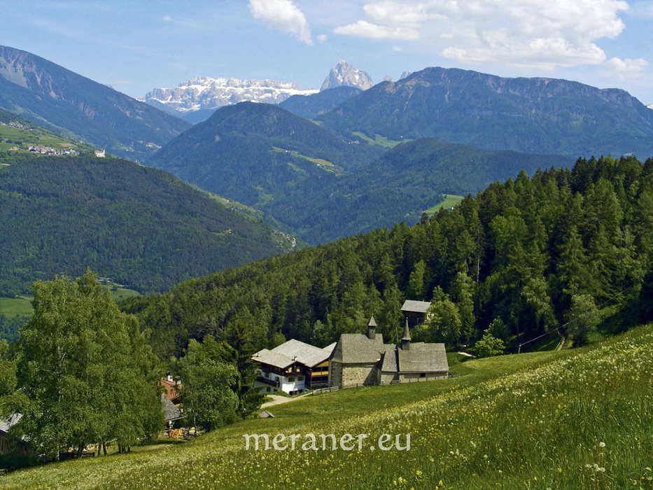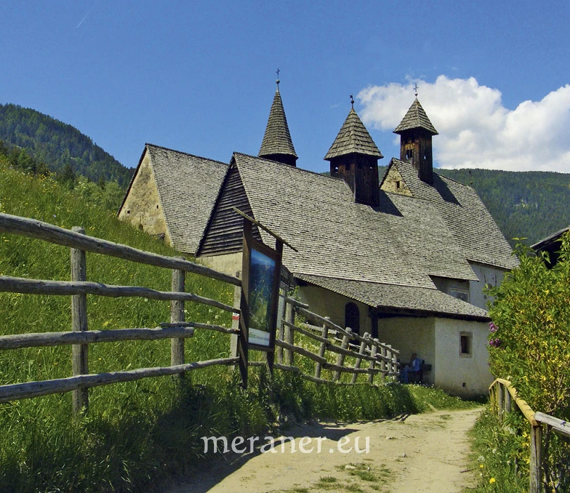 Wegverlauf: Von Barbian (830 m) folgen wir der Straße oberhalb der Kirche ein Stück nordwärts, bis links der asphaltierte Weg Nr. 3 abzweigt, der zum oberen Dorfrand führt. Auf dem teilweise gepflasterten Weg Nr. 3 gelangen wir durch Wiesen hinauf zu einer Wegkreuzung. Hier wenden wir uns nach links (Nr. 6), wandern auf der Höfestraße über Wiesen an einigen Höfen vorbei zur nächsten Wegkreuzung, an der der Weg Nr. 6 (auf den Hinweistafeln die alte Markierung Nr. 8 N) nach rechts abbiegt und uns, die Waldhänge querend, bis Dreikirchen führt (1.123 m, Einkehrmöglichkeiten: Messnerhof – hier gibt es die Schlüssel zu den Kirchen – und das Badgasthaus; ab Barbian 1 ½ Stunden).