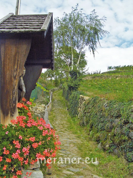 Die Waale, eine im Laufe von Jahrhunderten ausgeklügelte Technik für die Fassung, den Transport und die Verteilung von Bewässerungswasser, um die Ernteerträge zu steigern, rufen immer wieder unsere Bewunderung hervor. Der Schenner Waal ist jüngeren Datums und reicht in das Jahr 1733 zurück. Kurz vor dem Gasthof Pichler kommen wir zu einer Treppe, die aus dem Felsen gehauen ist. Sie wird Katzenleiter genannt. Das Wasser fällt über eine kurze Strecke steil ab und überquert dann in Rohren den Schnuggenbach. Die „Stickle Gasse“ war als Fuß und Saumweg die wichtigste Verbindung zwischen Schenna und Meran und wurde deshalb unter Schutz gestellt.