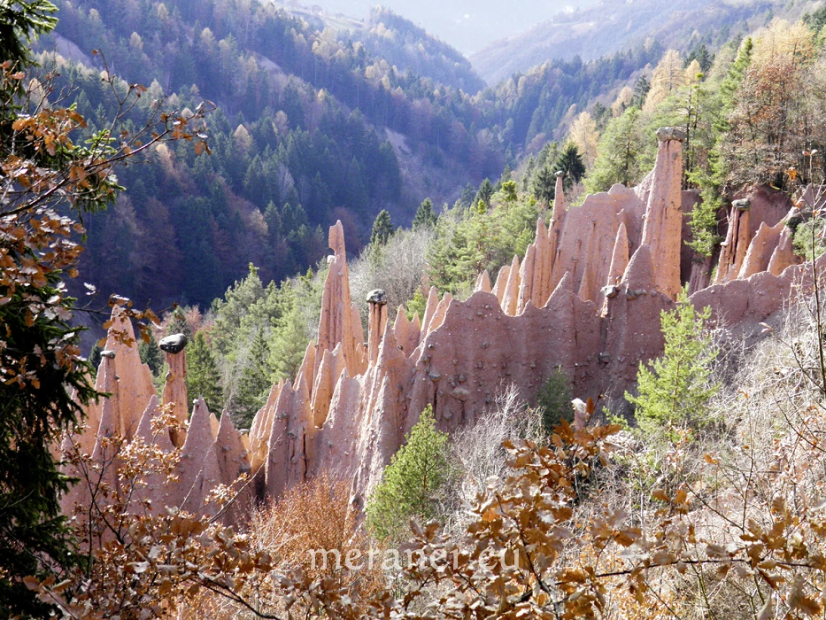 Besonderheiten: Die höchsten und formschönsten Erdpyramiden in Europa findet man am Ritten, und das gleich an mehreren Orten. Unsere Wanderung führt zu jenen im Katzenbachgraben unterhalb von Oberbozen. Erdpyramiden bestehen aus kegelförmig aufgeschüttetem Lehm und dem darauf liegenden Felsbrocken und bilden oft bizarre Landschaftsformen. Entstehen können sie in Böden aus späteiszeitlichem Moränenlehm. Diese Böden sind in trockenem Zustand steinhart, während sie – sobald es regnet – zu einem weichen Brei werden, abrutschen und so 10 bis 15 Meter hohe Steilhänge bilden. Weitere Regenfälle waschen diese Hänge aus; liegen allerdings im weicheren Erdmaterial Gesteinsbrocken, wird der Lehm unter diesen Felsen vor dem Regen geschützt und während das umliegende Material weiter und weiter vom Wetter abgetragen wird, wachsen die majestätischen Erdpyramiden förmlich aus dem Boden heraus. Die größten und schönsten Pyramiden bilden sich in Tausenden von Jahren. Ganz schnell vorbei ist es mit einer Erdpyramide, wenn der Deckstein erst einmal von der Spitze der Pyramide fällt: Das Material ist dadurch schutzlos dem Regen ausgesetzt und die Säule wird bei jedem Regen kleiner. Und während durch diesen Vorgang die eine Erdpyramide verschwindet, entsteht weiter oben am Hang schon die nächste.