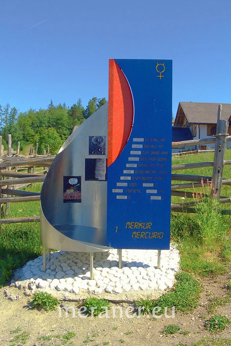 Ausgangspunkt unserer Wanderung ist die Kuppel der Sternwarte. Sie steht stellvertretend für die Sonne. Bis zum nahen Gasthof Unteregger finden wir bei km 0,058 den 1. Planeten Merkur, bei km 0,108 den 2. Planeten Venus und bei km 0,149 den 3. Planeten Erde dargestellt. Nahe dem Gasthof steigt der Weg in Richtung Norden leicht an bis zum Oberegger Hof, wo bei km 0,228 der 4. Planet Mars errichtet ist. Ab nun folgen wir immer den stählernen Hinweistafeln mit dem Namen des nächsten Planeten. Bald erreichen wir bei km 0,780 den 5. Planeten Jupiter. Neben dem Malgeier Hof wurde bei km 1,430 vor dem Panoramablick auf die Dolomiten der 6. Planet Saturn dargestellt. Vor dem Landgasthof Lärchenwald können wir bei km 3,0 den 7. Planeten Uranus bewundern. Nach dem Jaiter Hof und dem Haus Waldpeter erreicht der Rundwanderweg bei km 3,727 den höchsten Punkt (1.420 m). Bei km 5,250 kommen wir zur Bushaltestelle Schenk. Bei km 4,5 ist im Wald der 8. Planet Neptun errichtet. Im Bereich der Kreuzung mit dem Steinegger Höhenwanderweg befindet sich der niedrigste Punkt (1.250 m) der Wanderung. Am Aussichtpunkt Tschigg Hof bei km 7,375 treffen wir auf den 9. Planeten unseres Sonnensystems, auf Pluto. Anschließend gelangt man auf einem Waldsteig zum Ausgangspunkt zurück.