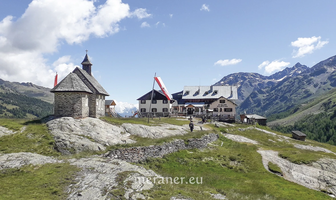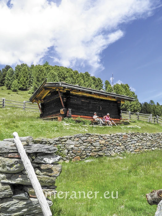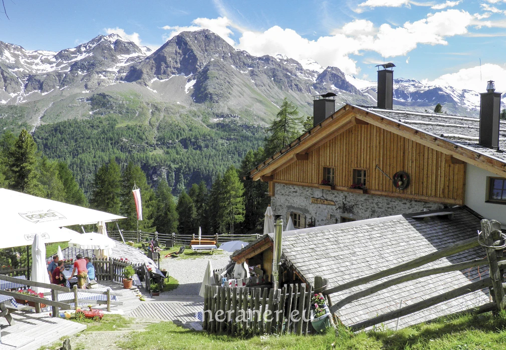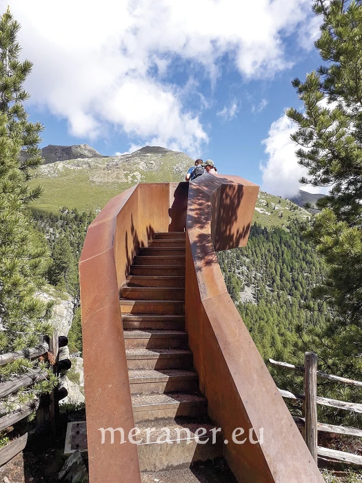 Wegverlauf: Vom Parkplatz (2.051 m) gehen wir kurz auf der Asphaltstraße aufwärts und folgen dem Hinweis „Erlebnis Plimaschlucht“ über die Brücke auf die andere Talseite. Nun wandern wir, vorbei an einem kleinen Weiher, dem ehemaligen Hotel Paradiso und mehreren Schautafeln leicht ansteigend zu den begehbaren Installationen aus Corten-Stahl: Kelle in der Klamm, Panoramasichel und Aussichtskanzel. Danach überqueren wir die Schlucht auf der Hängebrücke und erreichen die Zufallhütte (2.256 m, Einkehrmöglichkeit; ab Parkplatz 1 Stunde). Nun wandern wir auf dem Steig Nr. 33 bergauf und ins Madritschtal hinein, bis kurz nach einer Brücke rechts der Weg (Nr. 33) am Hang ansteigend in langer Querung hinaufführt zum höchsten Punkt der Wanderung „Auf dem Gelenk“ (2.450 m), wo sich ein Aussichtsplatz befindet. Nun wird der Weg etwas alpiner und wir wechseln ins einsame Pedertal. Nach Querung der Hänge wenden wir uns an der Weggabelung nach rechts und gelangen auf dem Steig Nr. 33A in Serpentinen hinunter in den Talboden. Eine Weile wandern wir den Bach entlang talauswärts (Nr. 20 und dann 20A) und erreichen die Peder-Stieralm (2.252 m, nicht bewirtschaftet). Nun folgen wir der Markierung Nr. 35 und wandern über Wiesen und Wald erst leicht ansteigend und dann eine Weile bergab bis zur Lyfi-Alm (2.165 m, Einkehrmöglichkeit, Montag Ruhetag, außer im August; ab Zufallhütte 3 Stunden). Auf dem breiten Weg Nr. 8 und 39 wandern wir durch den Wald bis zur Enzian-Alm (keine Einkehrmöglichkeit) und zum Parkplatz (ab Lyfi-Alm 1 Stunde).