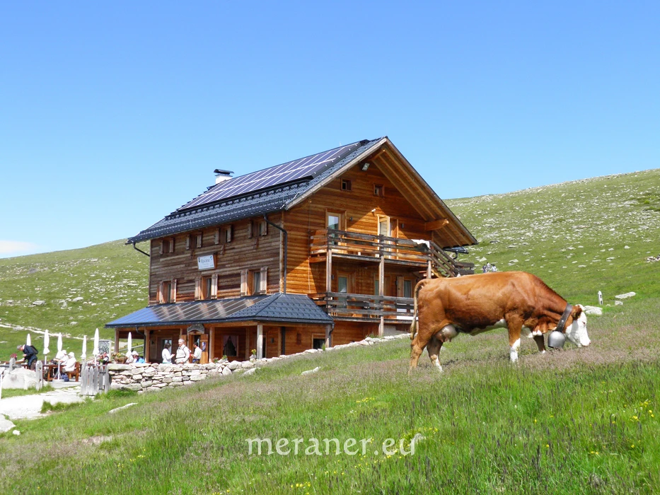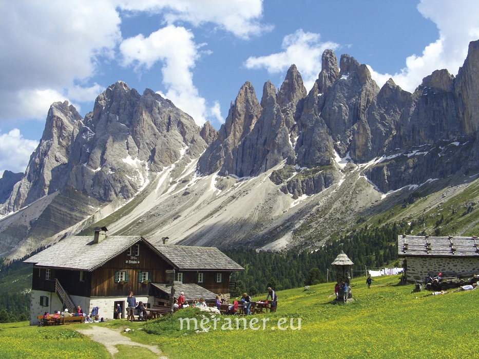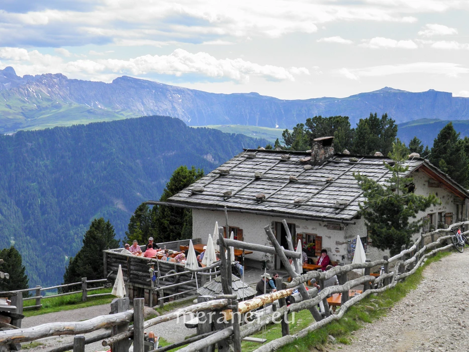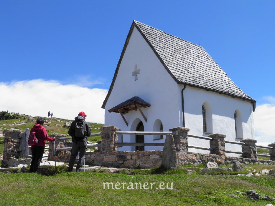 Wegverlauf: Von der Bergstation (2.095 m, Einkehrmöglichkeit im nahen Restaurant Raschötz) wandern wir auf dem breiten Weg Nr. 35 leicht ansteigend zur Raschötzhütte (2.164 m, Einkehrmöglichkeit) und weiter westwärts zur Heilig-Kreuz-Kapelle (2.198 m; ab Bergstation 30 Minuten). Auf unschwierigem Steig erreichen wir nach ca. 20 Minuten das Raschötzer Kreuz auf dem Gipfel der Außerraschötz (2.281 m). Auf Steig Nr. 10 steigen wir ab zum querenden Höhensteig Nr. 31, auf dem wir zur Flitzer Scharte (2.107 m) gelangen. Nun wandern wir kurz bergauf und erreichen den Weg Nr. 35, auf dem wir, freie Hänge ostwärts querend zum Broglessattel (2.119 m) und kurz absteigend zur Brogleshütte gelangen (2.045 m, Einkehrmöglicheit; ab Raschötzer Kreuz ca. 1½ Stunde). Von der Hütte kehren wir auf dem Hinweg zurück, bleiben bei der Weggabel auf dem linken, breiten Weg (Nr. 31 und 35, Hinweis: „St. Ulrich“, nicht rechts zur Flitzer Scharte!), wandern bergab und dann wieder bergauf und erreichen zuerst die Saltnerhütte (2.111 m, Einkehrmöglichkeit) und kurz danach die Bergstation der Raschötzbahn (ab Brogleshütte 1½ Stunden).