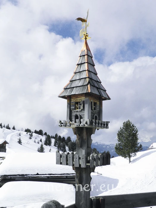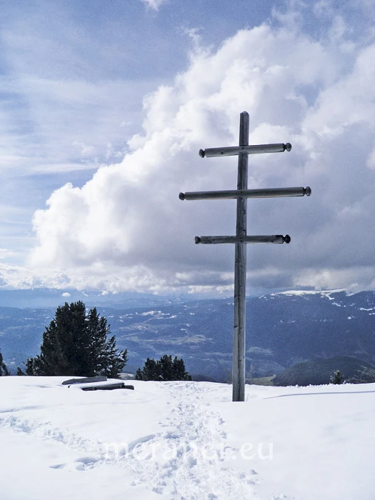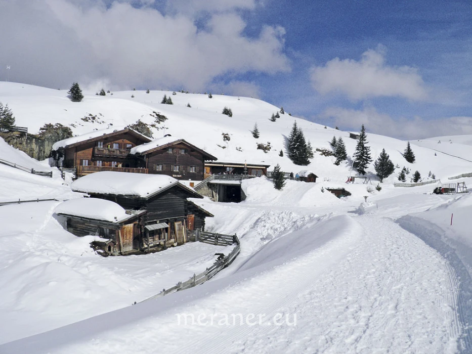 Wegverlauf: Von der Bergstation der Umlaufbahn (1.875 m) folgen wir der Beschilderung „Arnikahütte“ und wandern kurz auf der Hotelzufahrt und später auf breitem Winterwanderweg durch Wiesenhänge und durch einen Waldgürtel leicht bis mäßig ansteigend nordwestwärts hinauf zu einer Hochfläche. Hier befindet sich links etwas unterhalb des Weges die Schutzhütte „Dibaita“ (Einkehrmöglichkeit, Wintersaisonschluss noch nicht festgelegt). Nun folgen wir weiterhin dem breiten, gebahnten Wanderweg (Hinweis „Arnikahütte“) und erreichen nach mehreren kurzen Anstiegen und einem Abstieg die Arnikahütte (2.061 m, Einkehrmöglichkeit, Samstag Ruhetag, bis Ostern geöffnet; ab Ausgangspunkt ca. 1 ½ Stunden). Nun folgen wir dem Hinweis „Compatsch“ und wandern auf breitem Schneeweg südwestwärts leicht ansteigend zum Wetterkreuz auf der Hochfläche des Puflatsch (wunderschöne Aussicht, 2.090 m) und leicht absteigend über die freien Hänge zu dem im Aufstieg begangenen Weg und auf diesem zurück zur Bergstation der Umlaufbahn (ab Arnikahütte ca. 1 Stunde).
