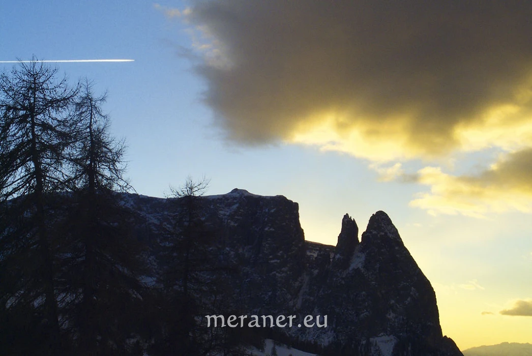 Besonderheiten: Der Puflatsch ist ein ziemlich freistehender Tafelberg mit einer ausgedehnten Hochfläche. An drei Seiten ragt er mit steilen, teilweise sogar senkrechten Felswänden empor. Doch auf seiner Südseite, von der Hotelsiedlung Kompatsch (auch Compatsch geschrieben) aus, kann man die Hochfläche des Berges sogar im Winter problemlos erreichen. Dort oben führt der Wanderweg durch eine unberührte, leicht hügelige Schneelandschaft. Die Arnikahütte liegt an einem Sonnenhang in einer windgeschützten Mulde. Auf dem Rückweg genießen wir beim Wetterkreuz eine großartige Aussicht und beim Abstieg den Blick über die weite Seiser Alm hinüber zum Langkofel, zum Plattkofel und zum Schlern.