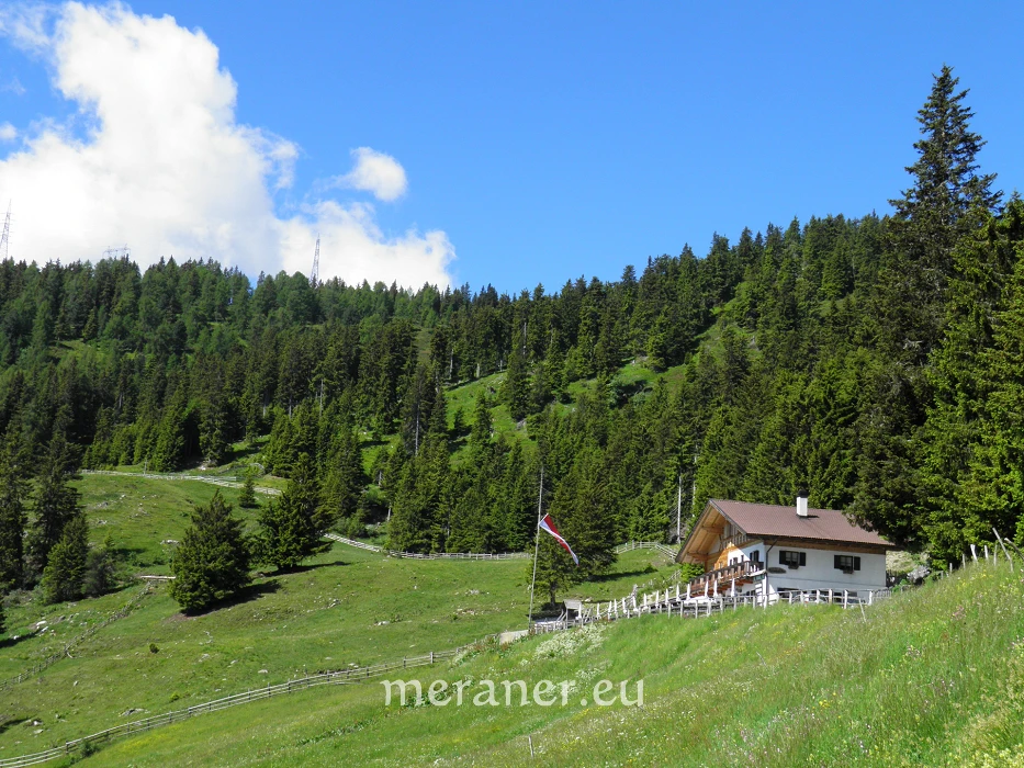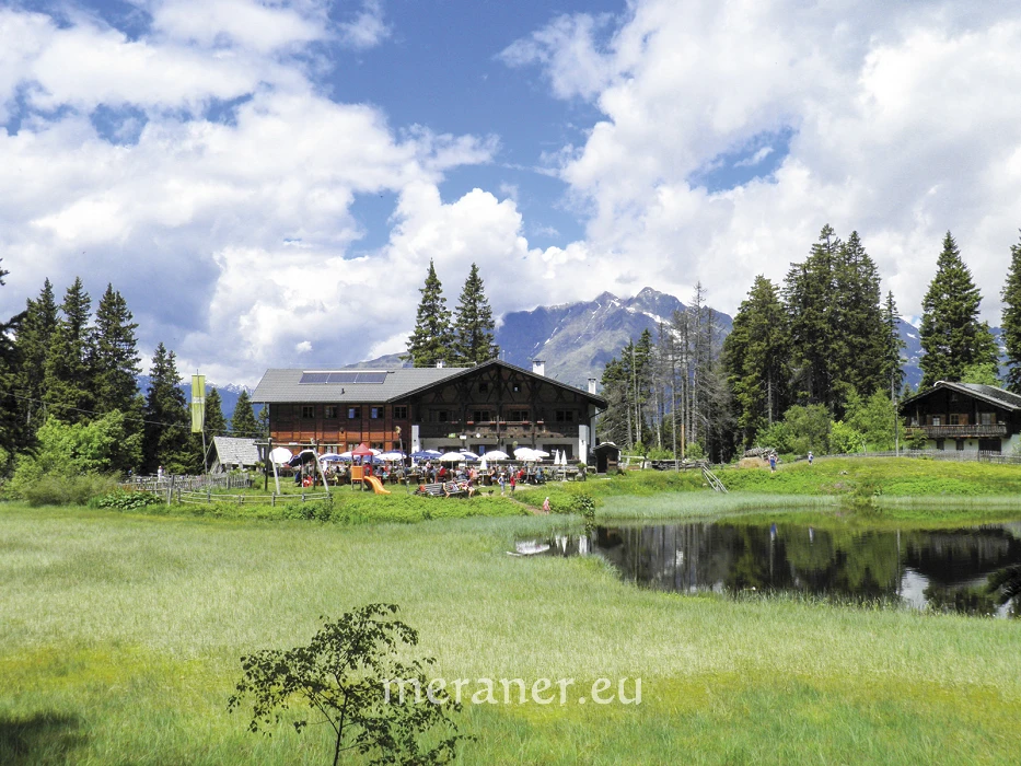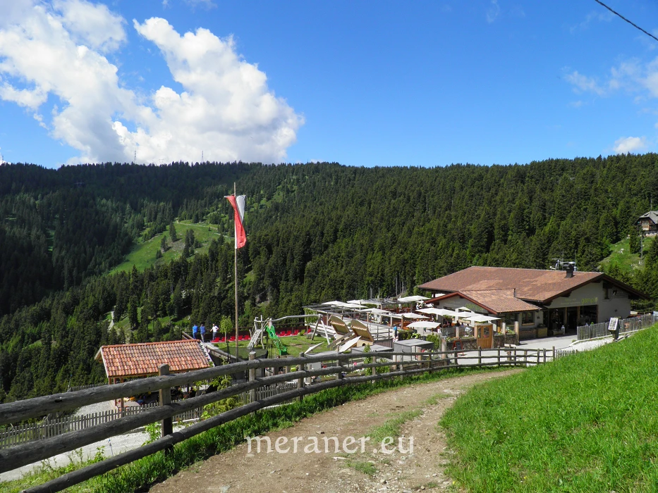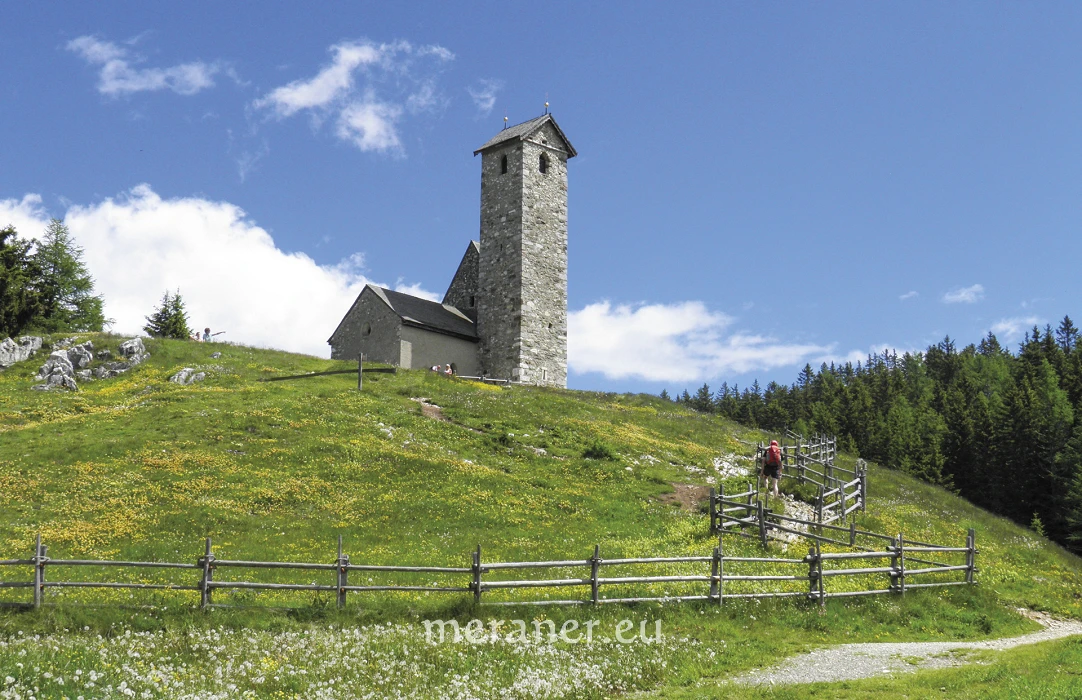 Wegverlauf: Von der Bergstation (1.490 m) wandern wir auf dem breiten Weg Nr. 34, vorbei am Hotel und an der Sesselliftstation bis zur Weggabel. Hier wenden wir uns nach links und folgen dem Weg Nr. 13, auf dem wir in leichtem Anstieg durch den Wald und dann auf der Forststraße etwas mehr ansteigend die Bärenbadalm erreichen (1.680 m, Einkehrmöglichkeit, Donnerstag Ruhetag, außer Juli und August; ab Bergstation 50 Minuten). Nun folgen wir dem breiten Weg Nr. 2 durch den Wald und gelangen zum eigentlichen Vigiljoch (1.747 m, Wegweiser), wenden uns nach rechts und wandern auf dem breiten Weg hinunter zum Almgasthof Gampl (1.705 m), Einkehrmöglichkeit, ganzjährig geöffnet; ab Bärenbadalm 20 Minuten). Nun wenden wir uns nach links und steigen auf dem Weg Nr. 3 hinauf zum Gasthof Jocher (geschlossen) und weiter hinauf zum Kirchlein St. Vigilius (1.790 m, ab Gampl 20 Minuten). Auf der Nordseite folgen wir dem schmalen Steig hinunter zum Wanderweg Nr. 9, auf dem wir durch Almwiesen leicht abwärts und dann eben an mehreren geschichtsträchtigen Sommerfrischhäusern vorbei das Biotop „Schwarze Lacke“ und den Gasthof Seespitz erreichen (1.751 m, Einkehrmöglichkeit; ab Kirche 30 Minuten). Am östlichen Ufer des kleinen Sees beginnt der Wanderweg Nr. 7, auf dem wir in leichtem Auf und Ab durch den Wald wandern, das Wetterkreuz „Schwarzwaldwiese“ (1.745 m) erreichen und bald freie Ausblicke auf Meran, Lana, das Etschtal, den Mendelkamm, den Tschögglberg und bis in die Dolomiten genießen können. Der Weg mündet dann in den breiten Forstweg Nr. 34, auf dem wir die Bergstation (Einkehrmöglichkeit im nahen Hotel Vigilius Mountain Resort) erreichen (ab Gasthof Seespitz 1 Stunde 15 Minuten).