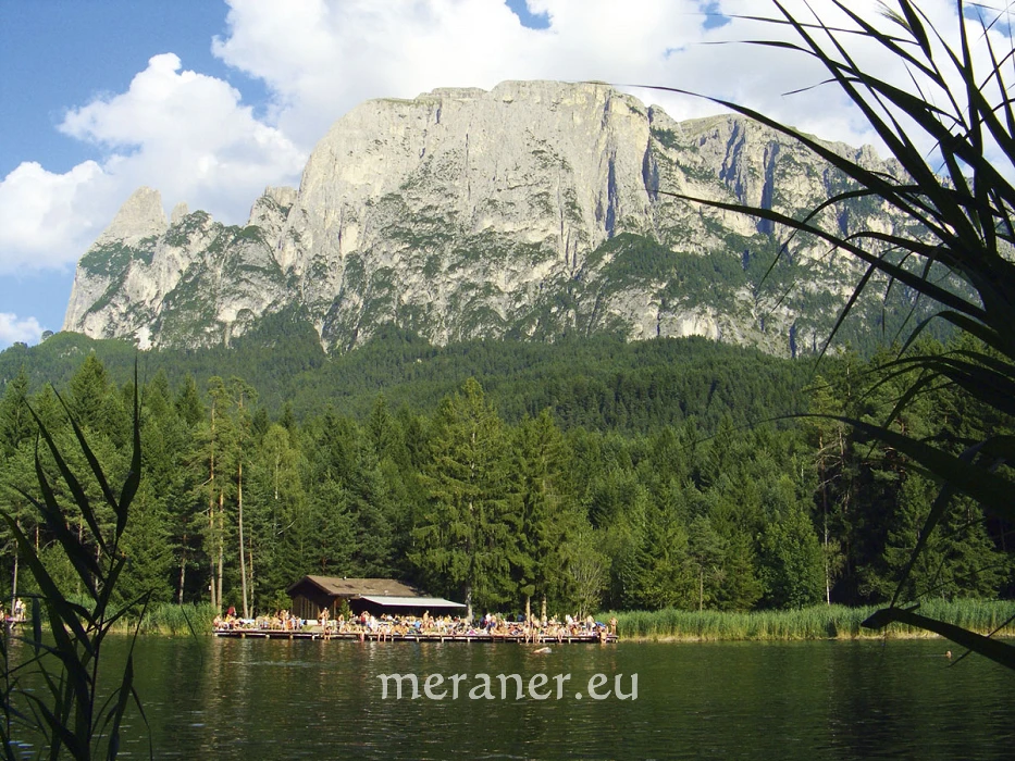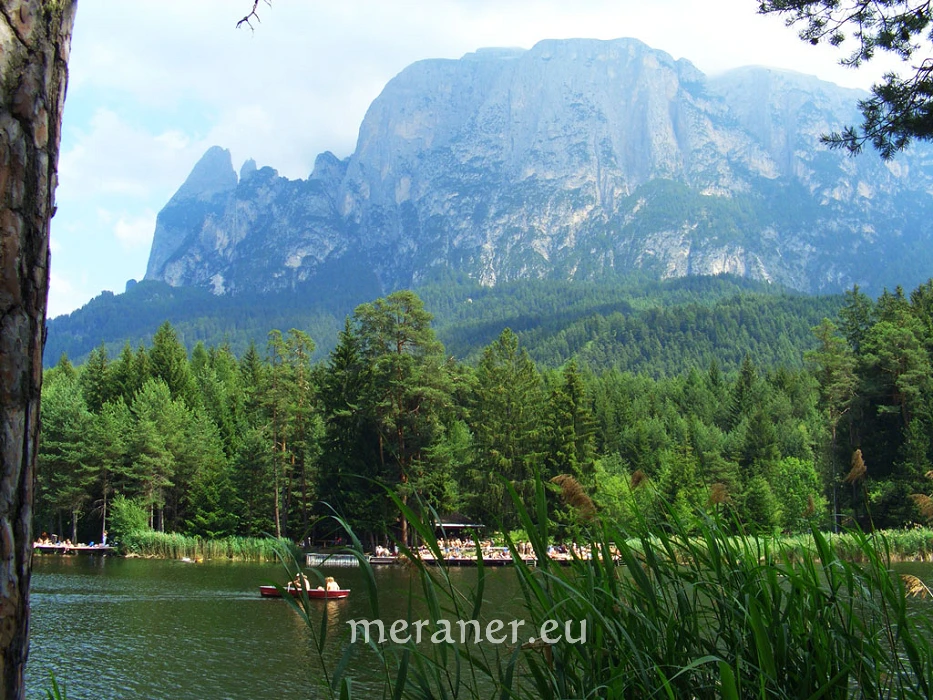 Vom Parkplatz in Ums folgen wir der Markierung 3 zuerst kurz auf der Asphaltstraße bis zu einigen Bauernhöfen, dann auf einem weiterhin mit der Nr. 3 gekennzeichneten Waldweg etwas steil die Hänge hinauf bis zum Hofer Alpl (1364 m, Almgasthof; ab Ums gut 1 Stunde). Nun wandern wir auf dem etwas oberhalb der Hütte beginnenden Waldsteig mit dem Hinweis „Völser Weiher“ nahezu eben nordwärts zum breiten Schlernweg Nr. 1 und auf diesem teils leicht, teils stärker absteigend zur Tuffalm (1.270 m, Gastbetrieb; ab Hofer Alpl ca. 45 Minuten). Nach dem Abstieg auf einem alten Pflasterweg mit der Markierung 1 erreichen wir den Huberweiher und etwas später den Völser Weiher (1.056 m, zwei Gastbetriebe; ab Tuffalm ca. 30 Minuten). Wir gehen vom Weiher den Weg kurz zurück bis zur Schranke, biegen dann rechts ab und wandern auf dem Waldweg Nr. 2 südwärts und hinunter zum Völser Bach. Nach der Brücke folgen wir kurz rechts dem Fahrweg und nehmen dann links den Wald- und später Wiesenweg zurück nach Ums (ab Völser Weiher ca. 45 Minuten).