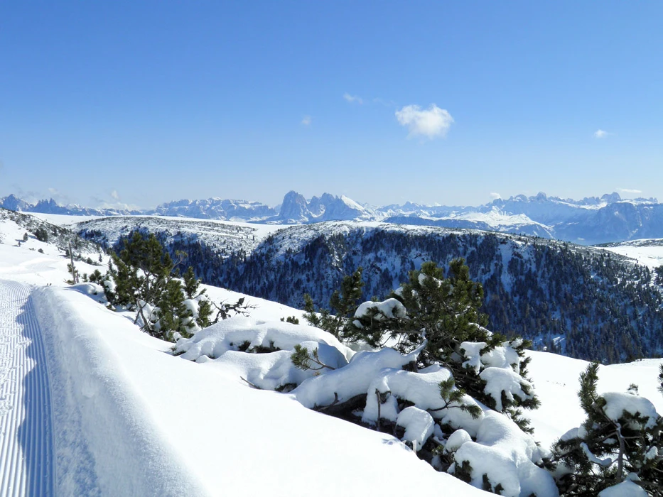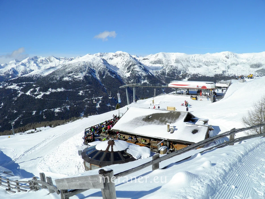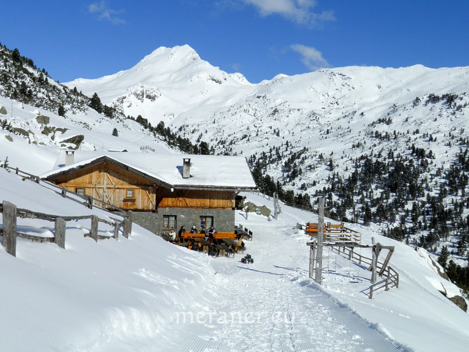 Besonderheiten: Vom Aufstiegsweg und dann vor allem vom Weg von der Bergstation zur Getrumalm bieten sich an schönen Tagen einmalige Ausblicke auf nahe und ferne Gebirgsketten und der Blick reicht vom Tribulaun bis zur Hohen Wilde, vom Ortler und von der Königsspitze über die Gipfel im Trentino bis zu den Felszacken der Dolomiten. Die Wanderung führt uns großteils abseits der Skipisten durch sonnenexponierte Wiesenhänge, auf denen nur Skitourengeher und Schneeschuhwanderer ihre Spuren durch den Schnee ziehen.