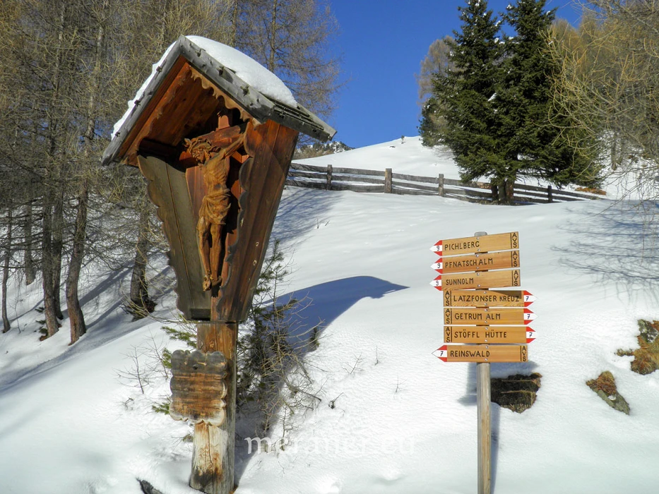 Wegverlauf: Von der Talstation wandern wir kurz neben der Rodelpiste hinauf, wenden uns dann nach links (Hinweis „Winterwanderweg“ auf blauem Grund) und steigen auf dem breiten, gebahnten Wanderweg stetig höher, wenden uns an der nächsten Weggabel nach links (Hinweis „Winterwanderweg“ und „Sunnolm“), wandern vorbei an der Sunnolm (1.850 m, Einkehrmöglichkeit), in Kehren teilweise auch etwas steil bergauf und zum Schluss durch eine Unterführung und erreichen das Restaurant Pichlberg an der Bergstation der Umlaufbahn (2.130 m, Einkehrmöglichkeit; ab Reinswald 2 Stunden). Hinter der Almhütte steigen wir nochmals kurz bergan (Nr. 11), überqueren eine Skipiste und gelangen zu einer Panoramatafel. Auf dem breiten Winterwanderweg queren wir die freien Hänge, folgen zweimal dem links abzweigenden, ausgetretenen Fußweg und erreichen die Getrumalm (2.100 m, Einkehrmöglichkeit, Montag und Dienstag Ruhetag; ab Pichlberg knapp 1 Stunde).