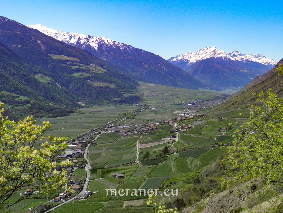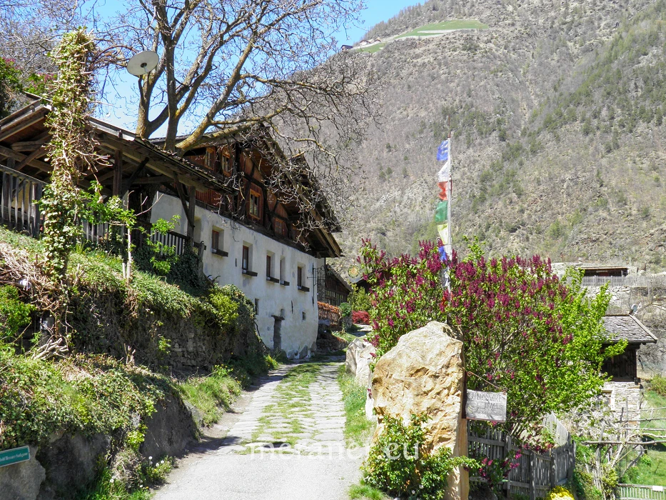 Wegverlauf: Vom Parkplatz folgen wir kurz der Straße, dann dem Fußweg Nr. 2 und dem „Kirchgassl“ und gelangen zur Kirche. Nun steigen wir der Nr. 1A / 3B und später der Nr. 3 folgend auf schmaler Straße hinauf zum Tscharser/Schnalser Waalweg, der bei Altratteis im Schnalstal beginnt und bei Galsaun endet. Hier wenden wir uns nach rechts und queren in angenehmer Wanderung, der Markierung 3 folgend, die Hänge des Vinschger Sonnenberges. Bei der Jausenstation Sonnenhof (Einkehrmöglichkeit, Freitag Ruhetag) steigen wir den Weg Nr. 1 hinauf zum Schloss Juval (927 m; ab Tschars ca. 1½ Stunden) und zum Hofschank Schlossbauer (Einkehrmöglichkeit, Mittwoch Ruhetag). Vom Schloss Juval erreichen wir, kurz die Asphaltstraße absteigend, den Gasthof Schlosswirt (Einkehrmöglichkeit, Mittwoch Ruhetag) und den Waalweg Nr. 3, auf dem wir bis zur Jausenstation Sonnenhof zurückkehren. Von dort wandern wir auf dem Weg mit der Nr. 1 etwas steil abwärts Richtung Staben, bis rechts der Stabner Waalweg abzweigt, auf dem wir nahezu eben und dann vorbei am Hotel Himmelreich (Einkehrmöglichkeit) und am Himmelreich-Hof (Einkehr mit Reservierung) zurück nach Tschars gelangen (ab Schloss Juval ca. 1½ Stunden).
