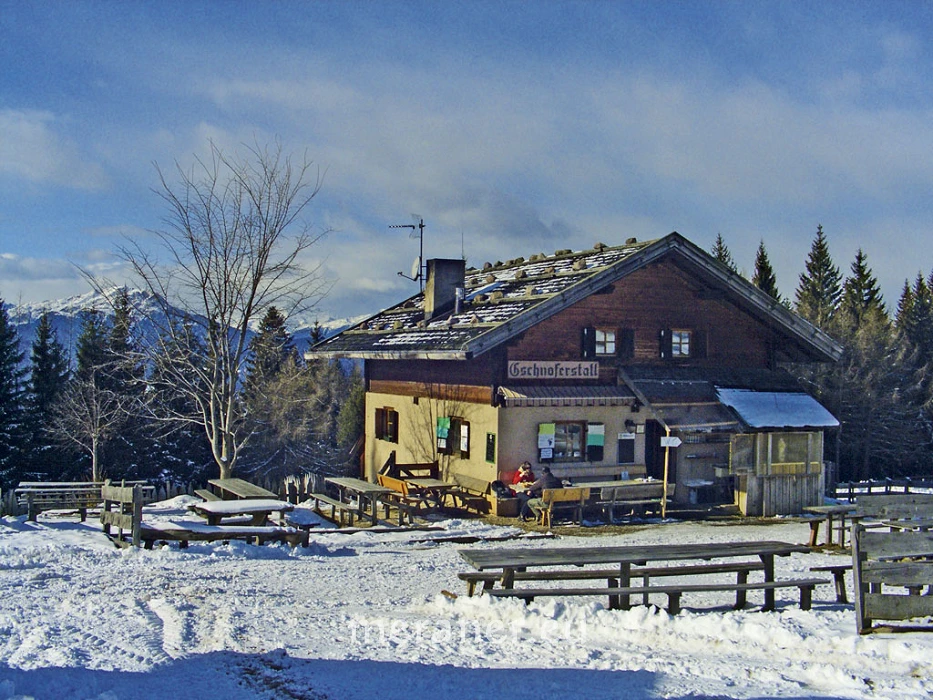 Wegverlauf: Von Verschneid (1076 m) wandern wir bergseitig an der Kirche vorbei und bei der nahen Straßenkreuzung links (Markierung L) die Höfestraße hinauf und den Forstweg entlang. Die erste Abzweigung zum Gschnofer Stall beachten wir nicht. Bald erreichen wir freie Lärchenwiesen, folgen bei der Abzweigung dem Weg mit der Markierung M und erreichen den zu einem kleinen Gasthaus umfunktionierten „Gschnofer Stall“ (1439 m, im Winter nur am Samstag und Sonntag geöffnet; ab Parkplatz gut 1 Stunde). Wir folgen dem Hinweis „Tschaufen“ und wandern auf einem Steig mit der Nummer 12 durch Wald kurz abwärts und dann eben über Lärchenwiesen, nehmen an der nächsten Weggabelung den Weg Nr. 10 und bald darauf den Weg Nr. 7, der rechts abbiegt, und gelangen, vorbei am Biotop Tschaufer Weiher, zum Gasthof „Tschaufen“ (1.304 m, ganzjährig geöffnet, Montag Ruhetag; ab Gschnofer Stall 1 Stunde). Auf der Zufahrtsstraße kehren wir nach Verschneid zurück (ab Tschaufen 45 Minuten).
