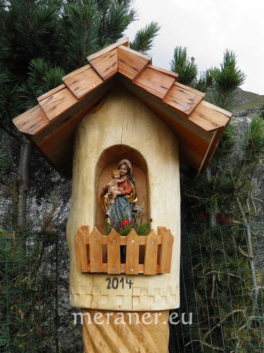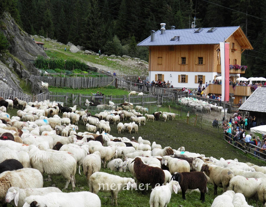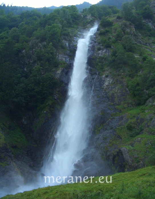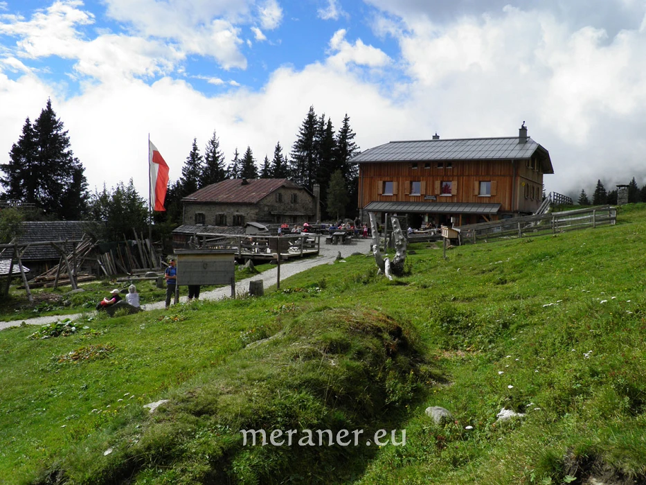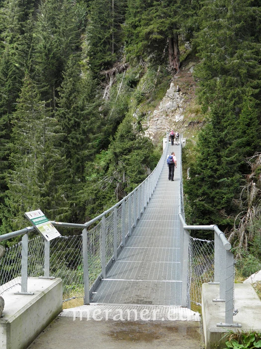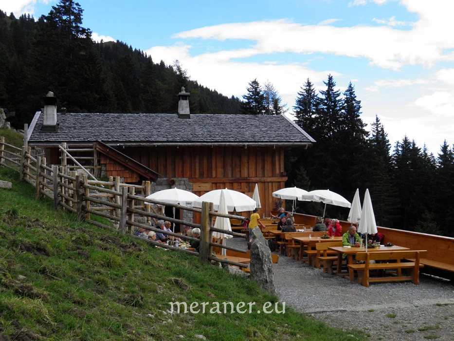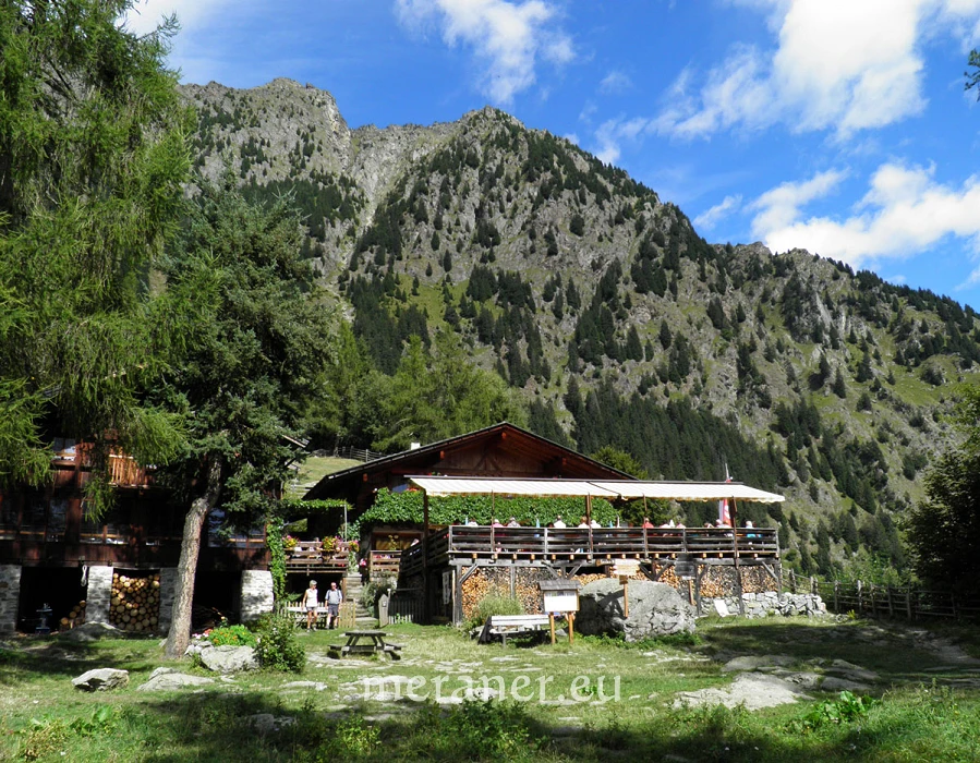 Wegverlauf: Von der Bergstation des Korbliftes erreichen wir nach wenigen Minuten die Leiteralm (1.522 m, Einkehrmöglichkeit). Hier wenden wir uns nach Westen bzw. links und folgen dem Weg Nr. 24 (Meraner Höhenweg), auf dem wir zuerst etwas steil bergwärts steigen und dann nahezu eben durch Waldhänge und durch mehrere Gräben zum Hochganghaus (1.839 m, Einkehrmöglichkeit; ab Leiteralm 1 ½ Stunden) gelangen. Wir wandern weiterhin auf dem Weg Nr. 24 und gelangen auf sehr aufwendig angelegten Platten nach 20 Minuten zur nicht bewirtschafteten Goidner Alm und die Steilhänge unter dem Tschigat querend zur neu errichteten Tablander Alm (1.839 m, Einkehrmöglichkeit; ab Hochganghaus 1 ½ Stunden). Auf dem Weg Nr 24 erreichen wir leicht absteigend das Schutzhaus Nassereith (1.523 m, Einkehrmöglichkeit; ab Tablander Alm knapp 1 Stunde). Wir wandern kurz auf dem breiten Zufahrtsweg abwärts und steigen dann auf dem schmalen, meist steilen Fußweg Nr. 8 und später Nr. 8A durch Wald und Wiesen das Zieltal hinunter zum Gasthof Wasserfall (1.073 m, Einkehrmöglichkeit; ab Nassereith knapp 1 Stunde). In wenigen Minuten kann man vom Gasthof den Partschinser Wasserfall erreichen. Mit dem Bus (es verkehren sowohl Shuttle- als auch Linienbusse) erreichen wir Partschins. Dort steigen wir um in den Bus nach Meran, mit dem wir zur Talstation des Sesselliftes in Oberplars gelangen.