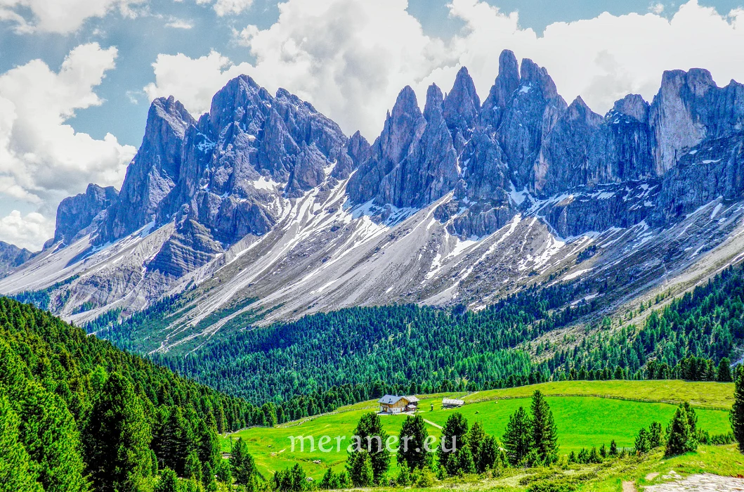 Unterhalb der Geislerspitzen verläuft der Adolf-Munkel-Weg, der 1905 von der Dresdner Alpenvereinssektion errichtet wurde und den wir erst verlassen, wenn wir zur Gschnagenhardt-Alm und zur Geisleralm abzweigen. Von diesen Almhütten bzw. Almgasthöfen bietet sich ein besonders schöner Blick auf die Geislerspitzen.