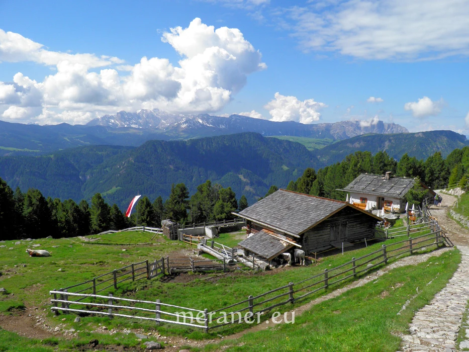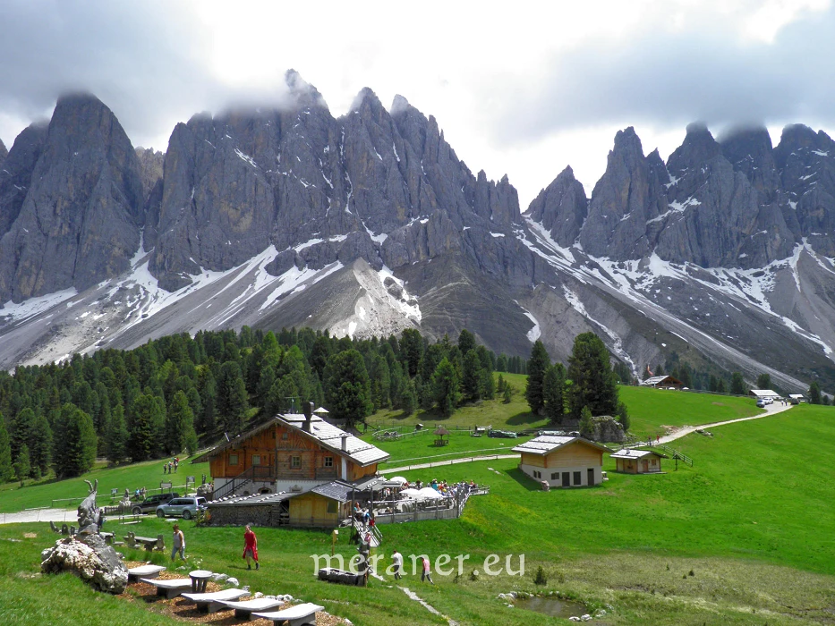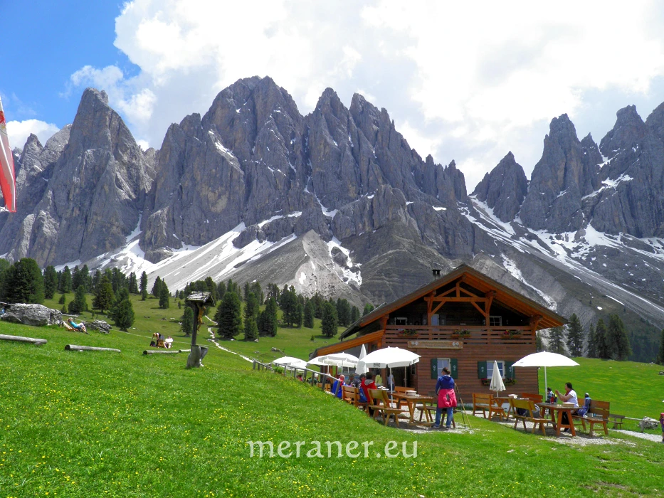 Wegverlauf: Von der Bergstation (2.095 m, Einkehrmöglichkeit im Restaurant Raschötz) wandern wir auf dem Weg Nr. 35 A kurz bergauf und bald rechts (Nr. 35 B und 10 B) ostwärts zur nahen Saltnerhütte (auch „Cason-Hütte“, 2.111 m, Einkehrmöglichkeit). Etwas oberhalb davon verlassen wir den breiten Weg, wenden uns nach links und steigen auf dem Steig Nr. 10 B kurz bergauf und erreichen auf dem bald rechts abzweigenden Steig Nr. 31 nahezu eben die Flitzer Scharte (2.107 m). Nun wandern wir kurz bergauf (Nr. 35 und Nr. 31) und erreichen den breiten Forstweg, auf dem wir, freie Hänge ostwärts querend zum Brogles-Sattel (2.119 m) und kurz absteigend zur Brogleshütte gelangen (2.045 m, Einkehrmöglichkeit; ab Bergstation Raschötz ca. 1½ Stunden). Nun folgen wir dem Adolf-Munkel-Weg Nr. 35 unterhalb der Geislerspitzen in mehrmaligem Auf und Ab, bis wir uns bei einer Weggabelung am Fuße des Sas Rigais nach links (Nr. 34) wenden, zuerst bergauf wandern und dann über die freien Grashänge zuerst die Gschnagenhardt-Alm (2.006 m, Einkehrmöglichkeit) und kurz darauf die Geisleralm (1.996 m, Einkehrmöglichkeit; ab Brogleshütte 1½ Stunden) erreichen. Von der Geisleralm wandern wir auf dem breiten Weg (Hinweis „St. Magdalena“; Nr. 34, später 34 A und dann 28) bergab und erreichen das Restaurant Waldschenke (Einkehrmöglichkeit) in Ranui im hinteren Villnöß (1.352 m, ab Geisleralm 1½ Stunden). Nach 10 Minuten gelangen wir zur Bushaltestelle an der Talstraße, etwas unterhalb des Kirchleins St. Johann in Ranui.